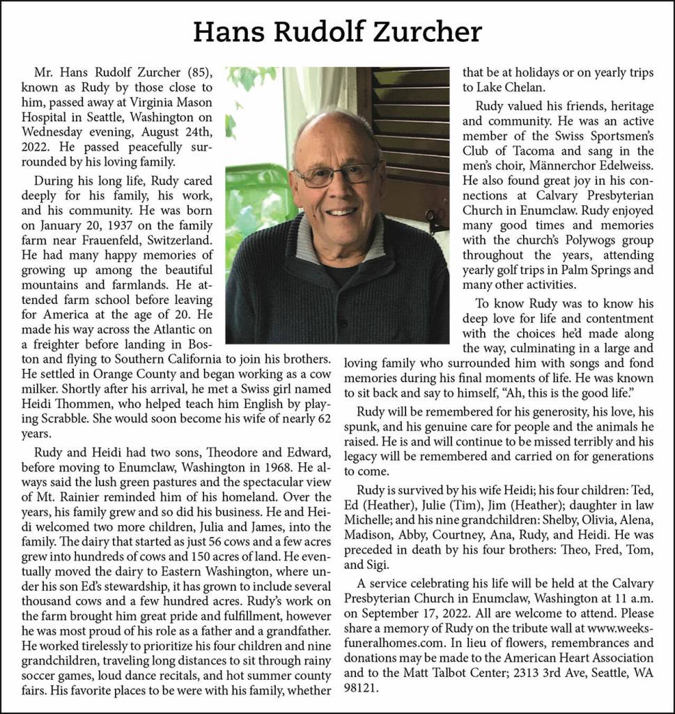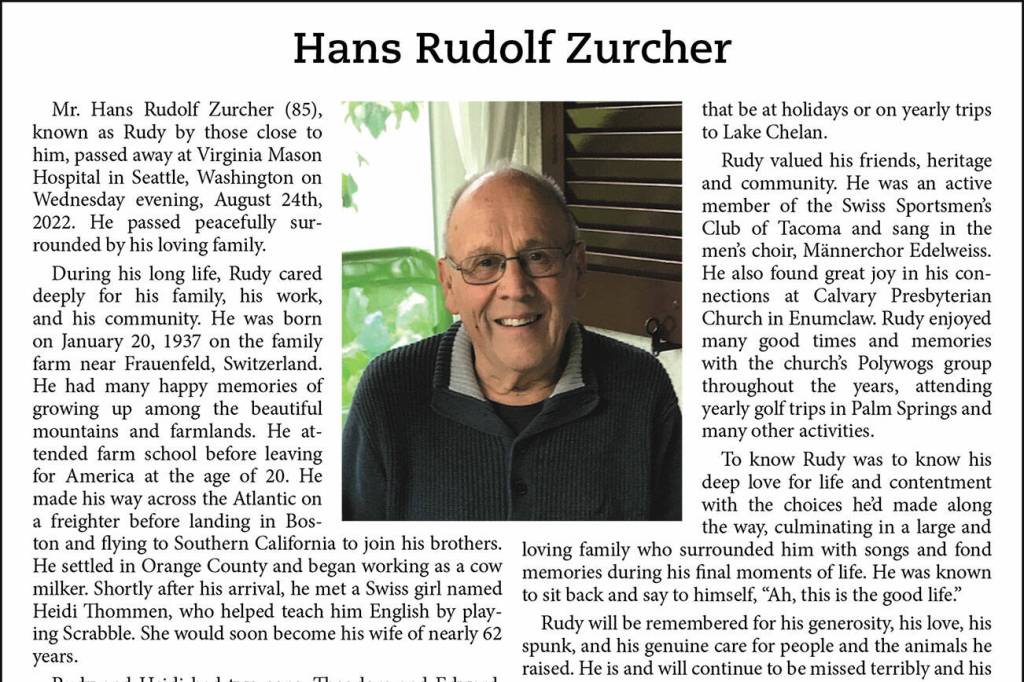 Hans Rudolf Zurcher died Aug. 24, 2022, at the age of 85.