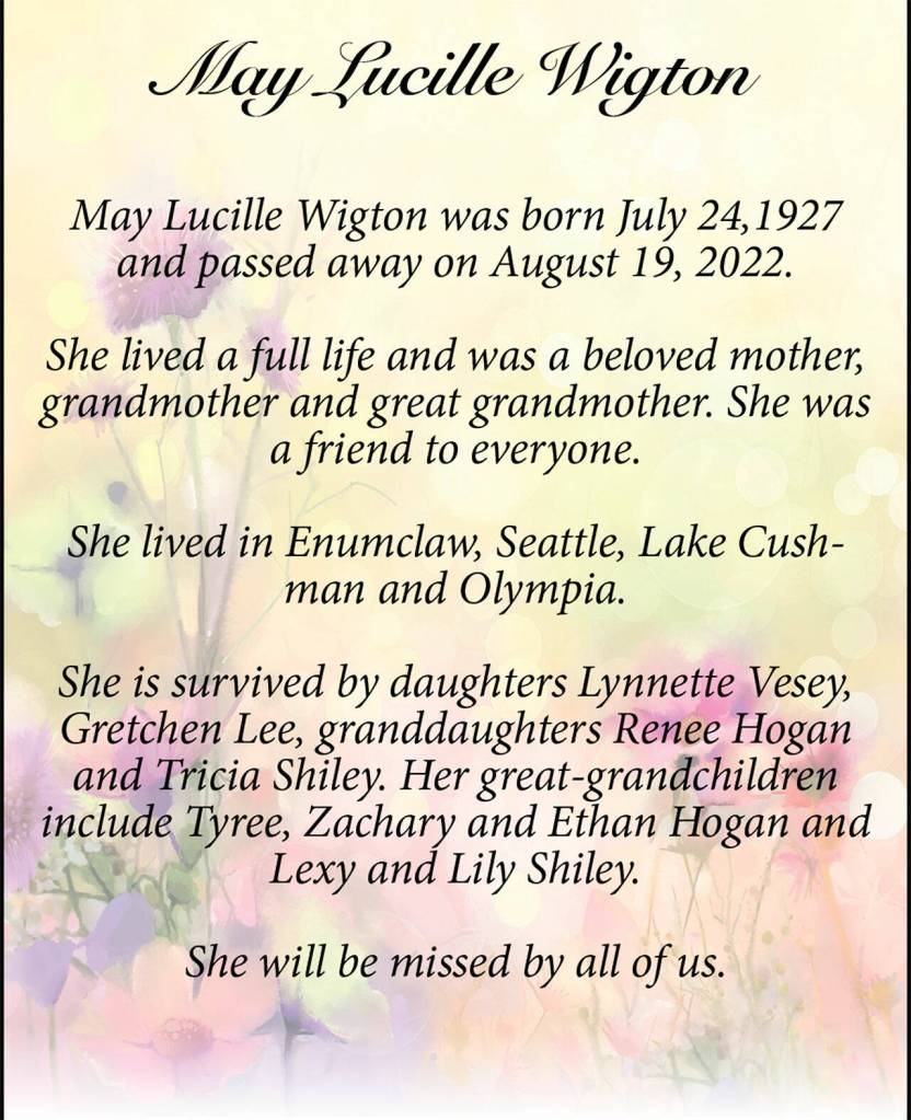 May Lucille Wigton died Aug. 19, 2022, at the age of 95.