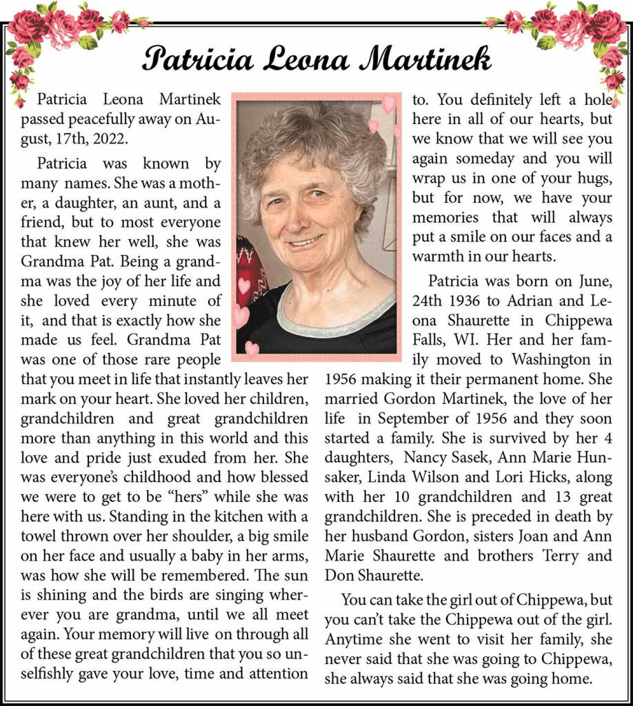 Patricia Leona Martinek died Aug. 17, 2022, at the age of 86.
