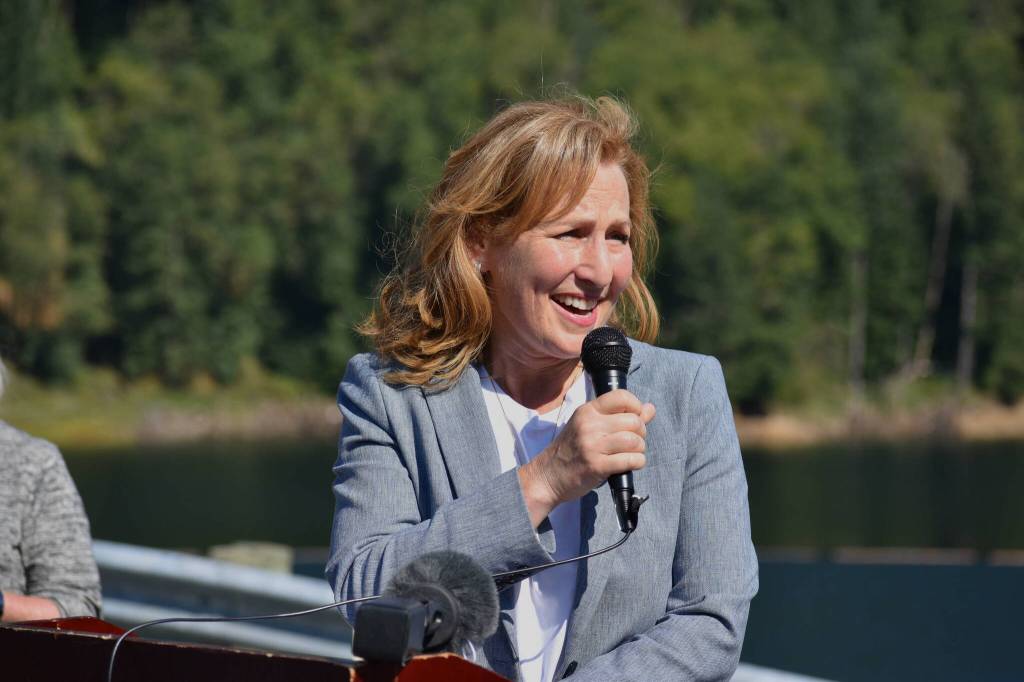 U.S. Representative Kim Schrier speaks during a ceremony celebrating fish passage efforts at Howard Hanson Dam near Ravensdale, Washington on Aug. 30, 2022. Photo by Alex Bruell.