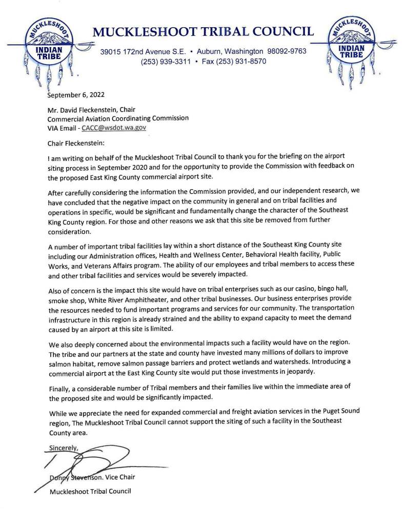 “While we appreciate the need for expanded commercial and freight aviation services in the Puget Sound region, the Muckleshoot Tribal Council cannot support the siting of such a facility in the Southeast County area,” the letter concluded.