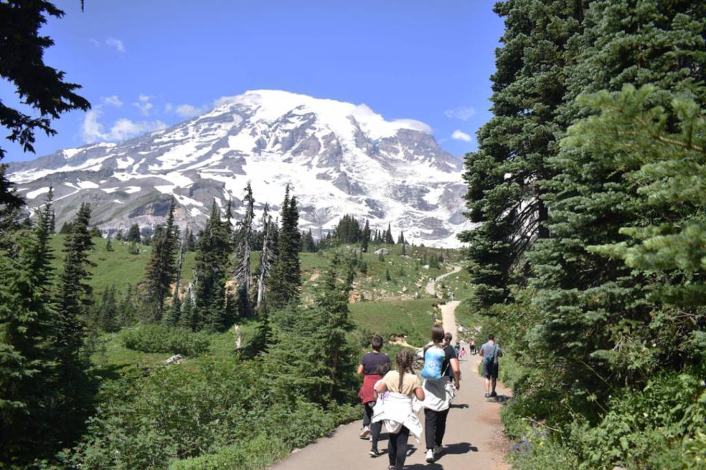 Hikers follow a path in the shadow of Mount Rainier. (Alex Bruell / Enumclaw Courier-Herald)
