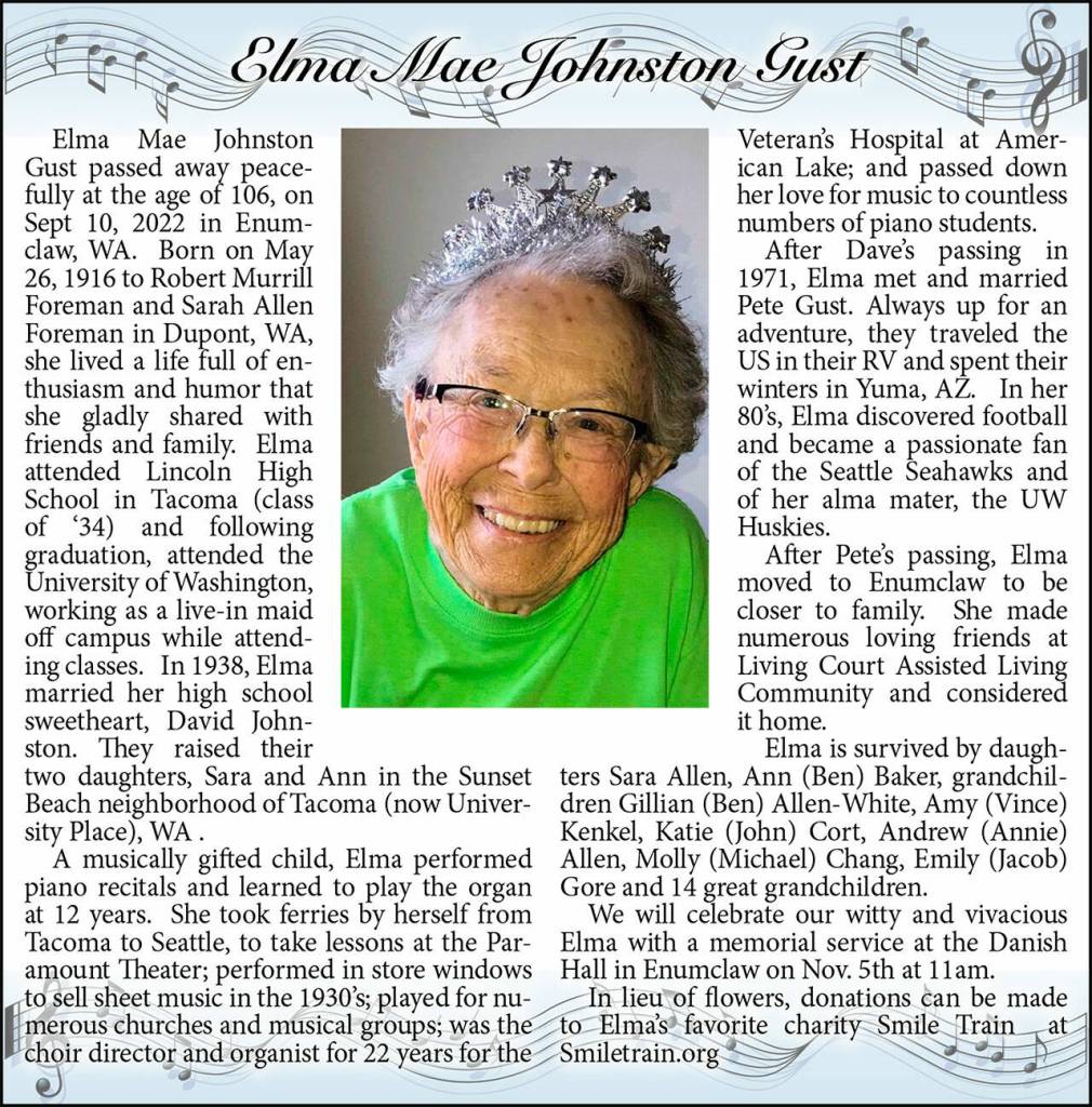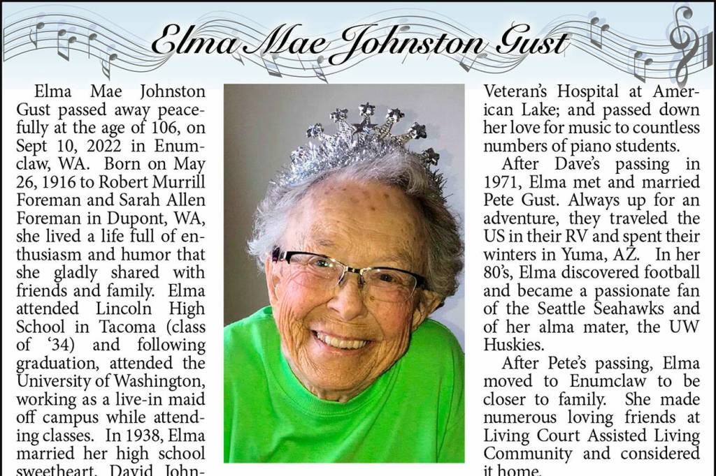 Elma Mae Johnston Gust died Sept. 10, 2022, at the age of 106.