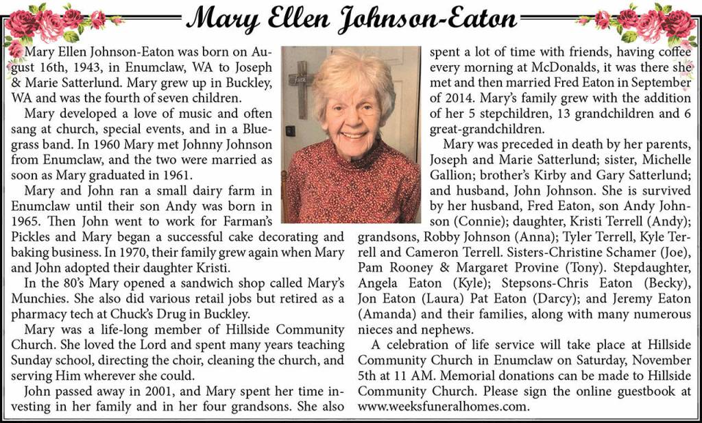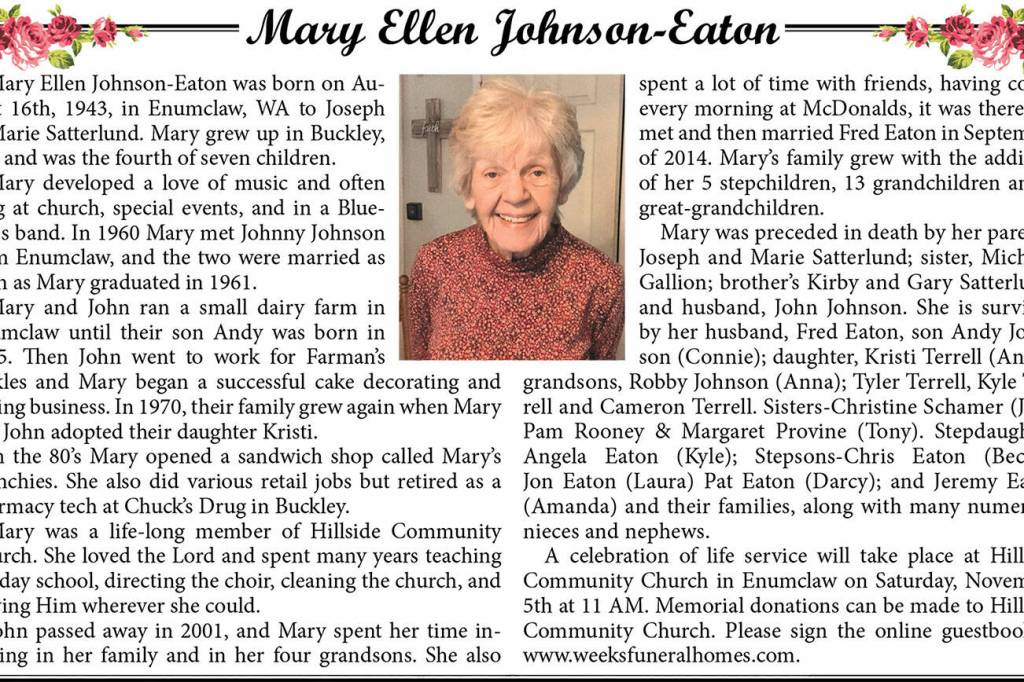 A memorial service for Mary Ellen Johnson-Eaton will be Nov. 11.