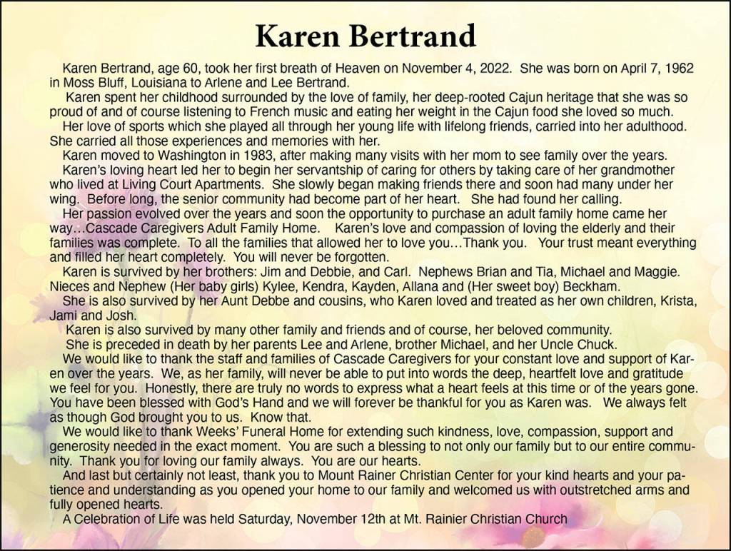 Karen Bertrand died Nov. 4, 2022, at the age of 60.