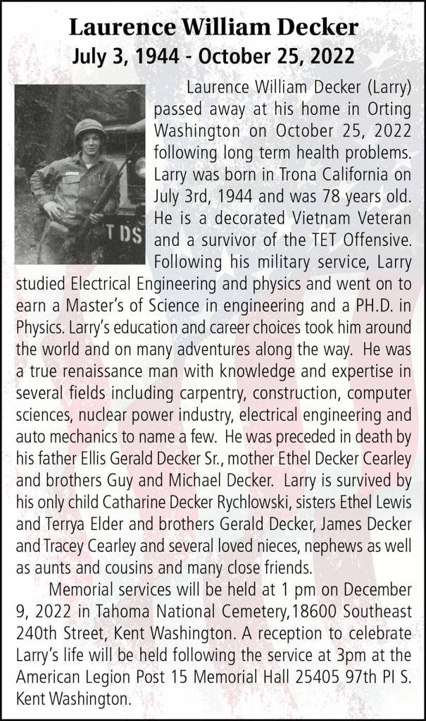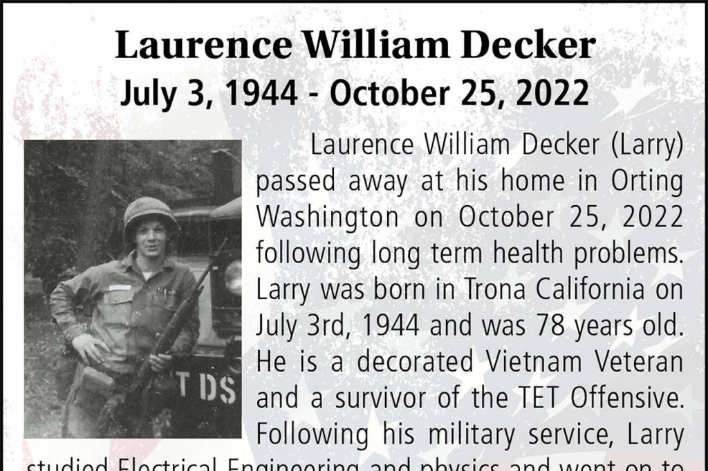 Laurence William Decker died Oct. 25, 2022, at the age of 78.