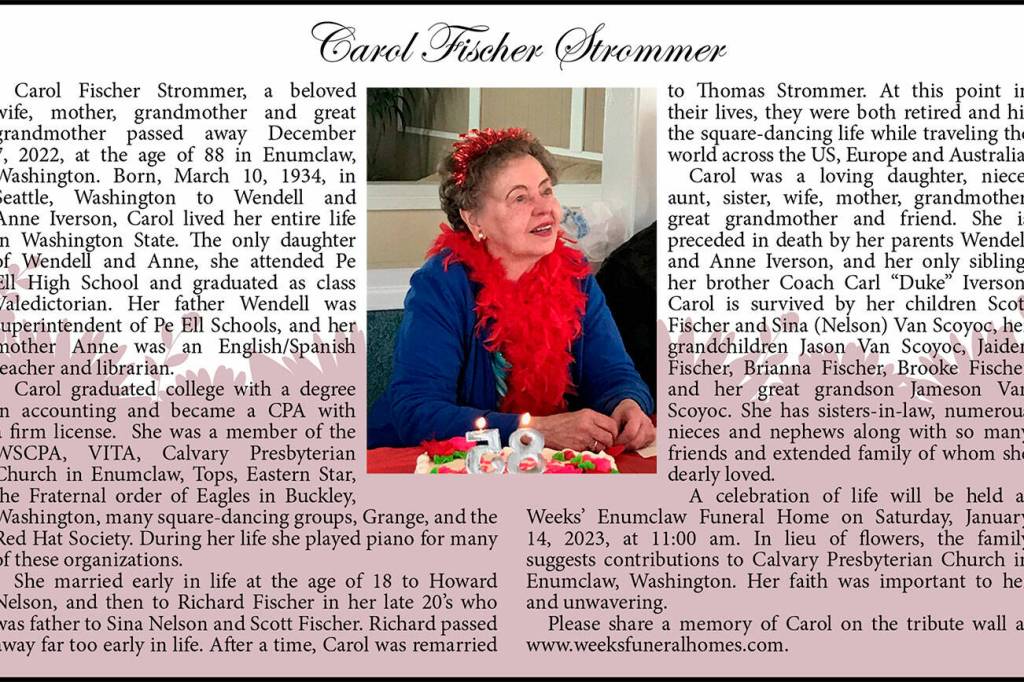 Carol Fischer Strommer died Dec. 7, 2022, at the age of 88.