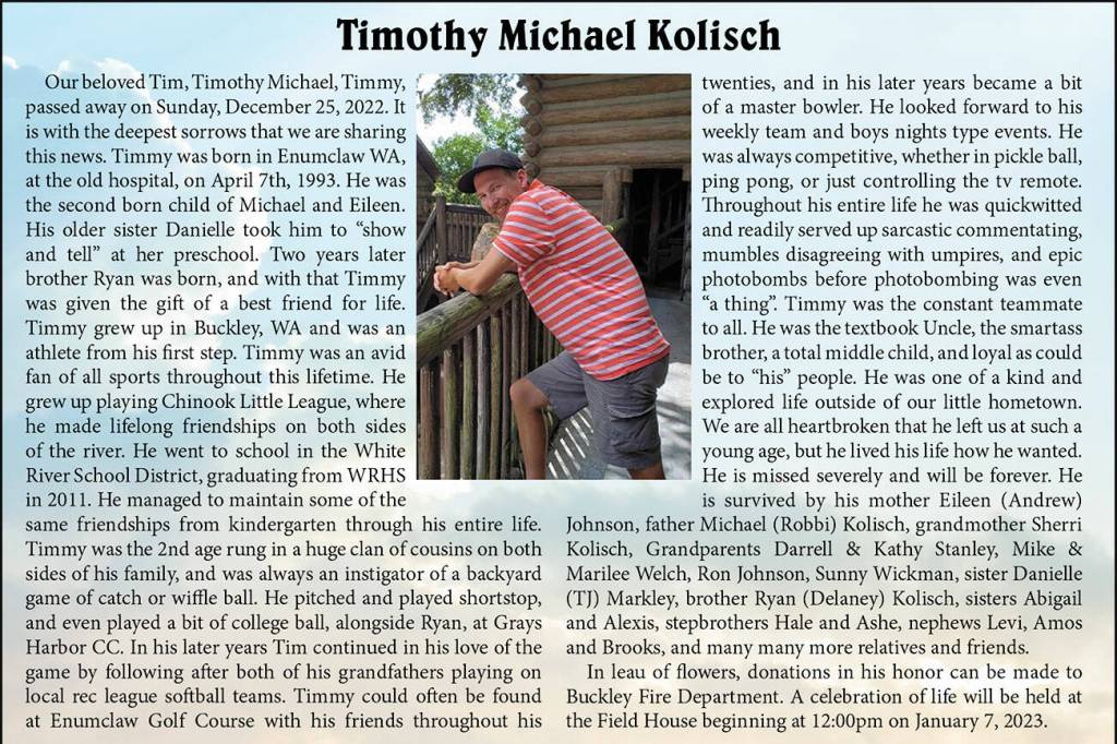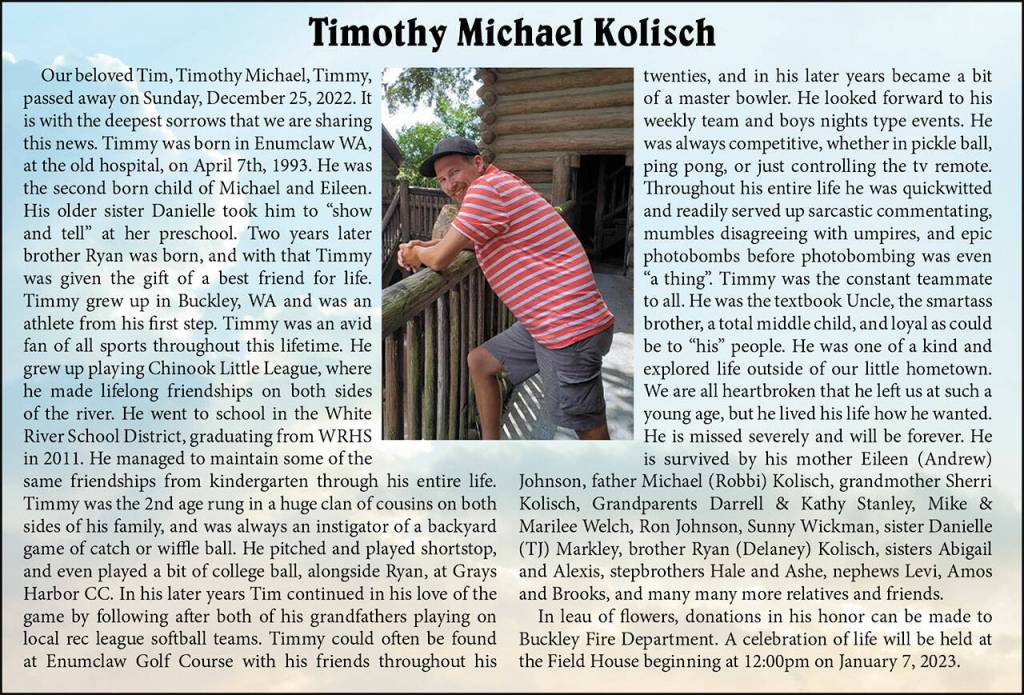 Timothy Michael Kolisch died Dec. 25, 2022, at the age of 29.