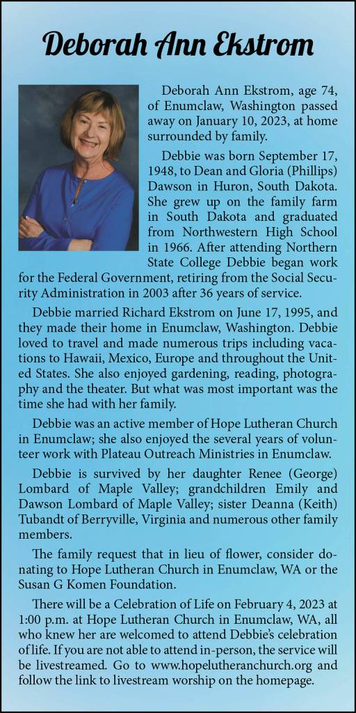 Deborah Ann Ekstrom died Jan. 10, 2023, at the age of 74.