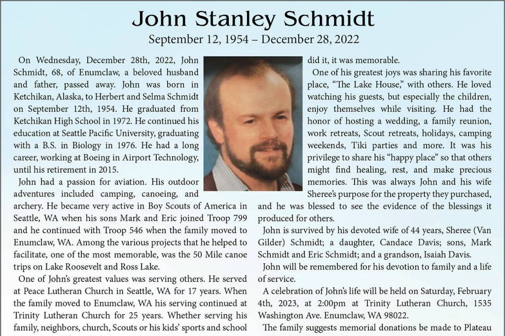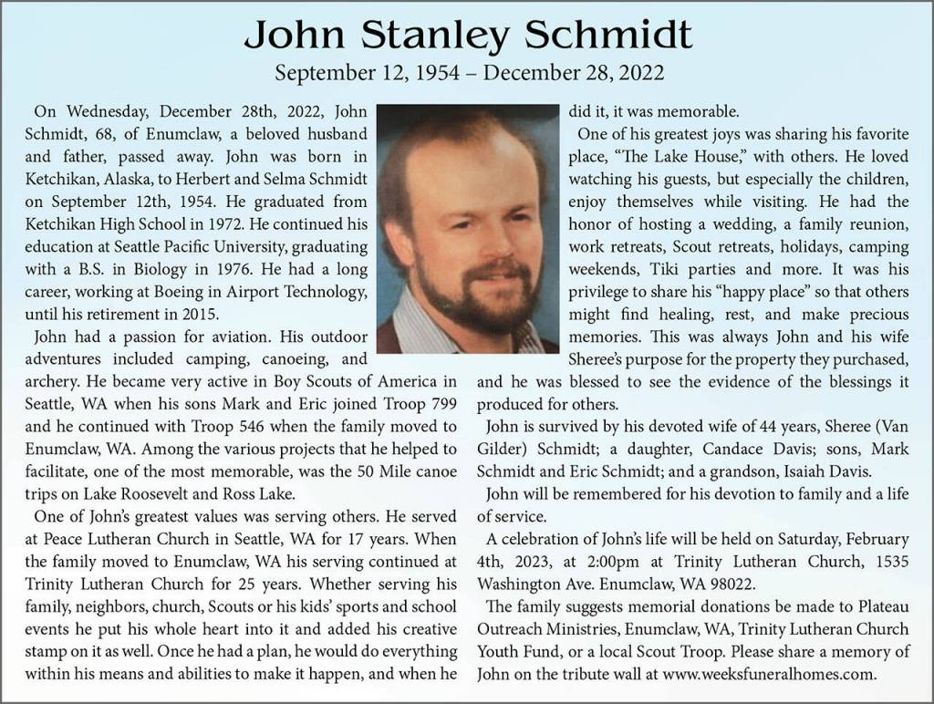 John Stanley Schmidt died Dec. 28, 2022, at the age of 68.
