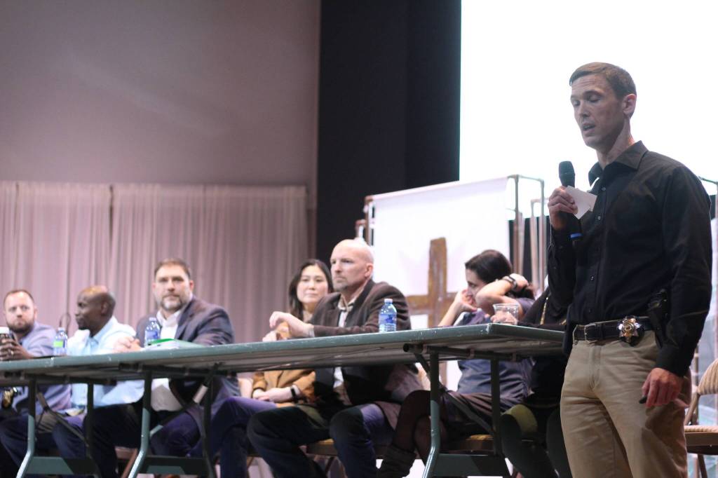 Emceeing the meeting was King County Deputy Chris Knudsen, and answering questions were representatives from the Department of Corrections, Department of Social and Health Services, and King County’s Sexual Assault Resource Center. Photo by Ray Miller-Still