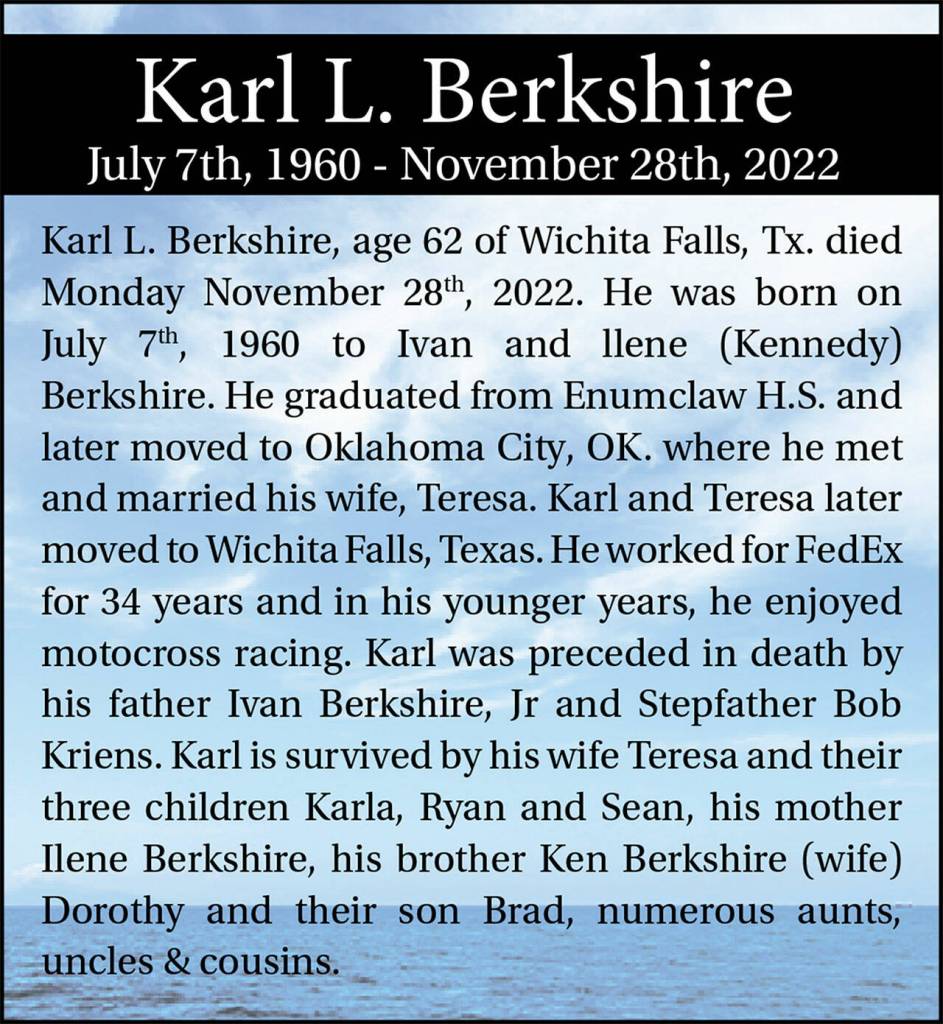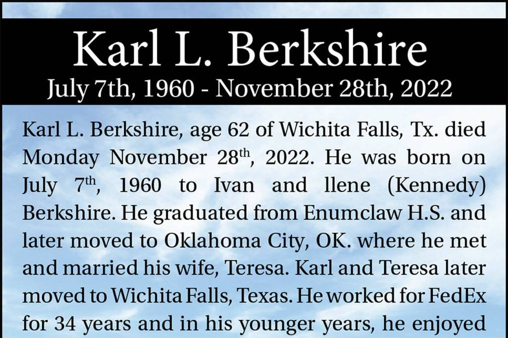 Karl L. Berkshire died Nov. 28, 2022, at the age of 62.