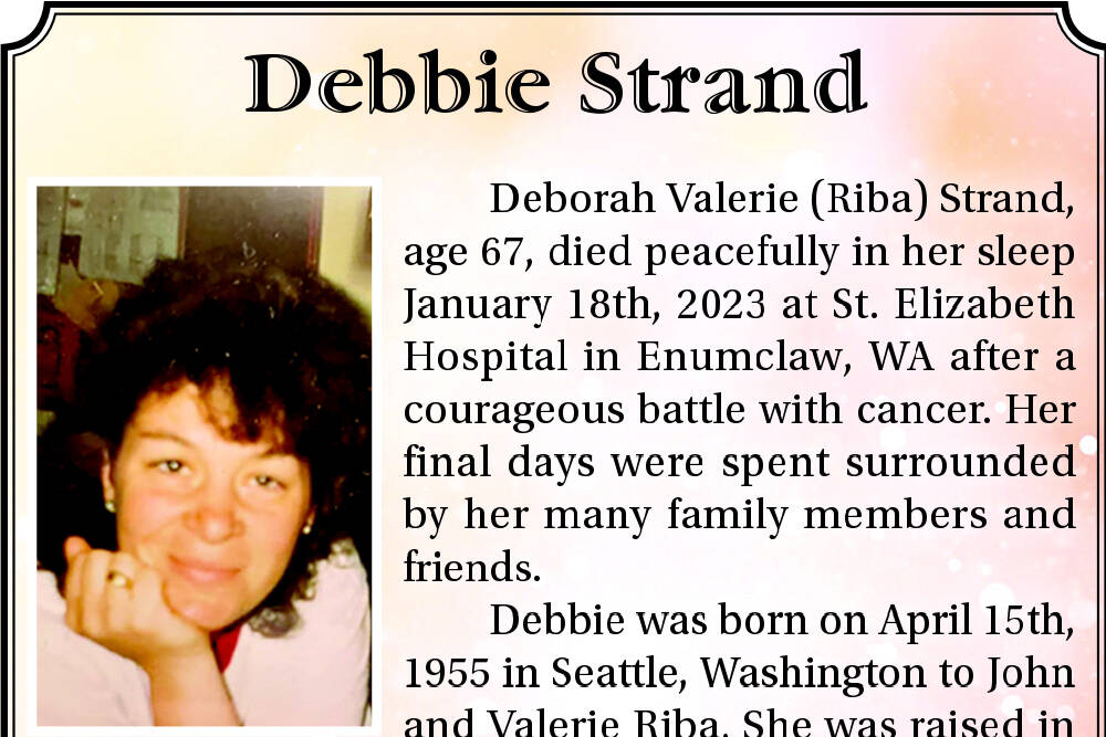 Deborah Valerie (Riba) Strand, age 67, died peacefully in her sleep January 18th, 2023 at St. Elizabeth Hospital in Enumclaw, WA after a courageous battle with cancer. Her final days were spent surrounded by her many family members and friends.