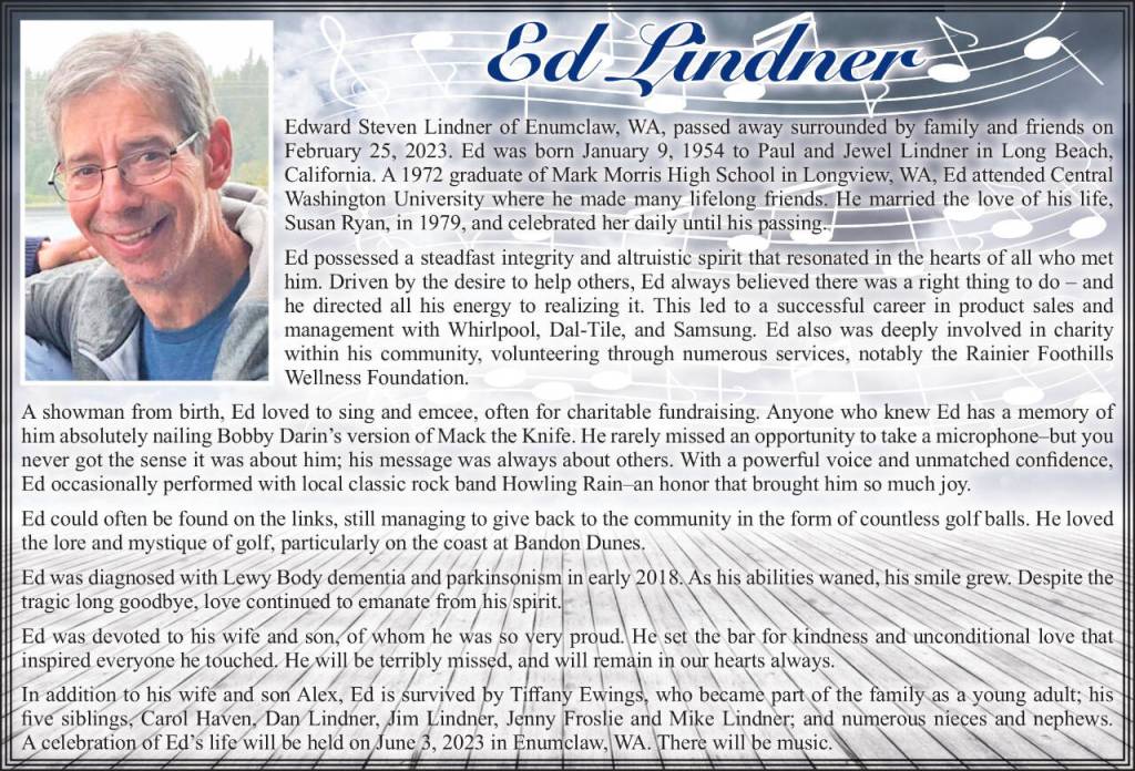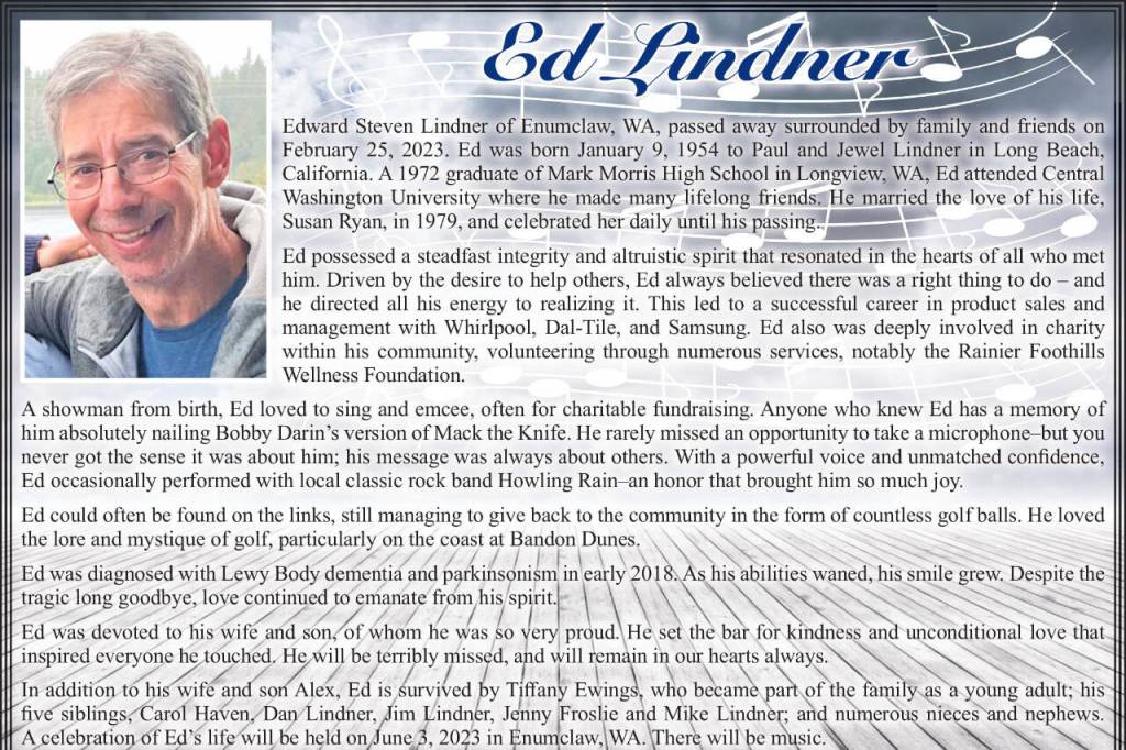 In addition to his wife and son Alex, Ed is survived by Tiffany Ewings, who became part of the family as a young adult; his five siblings, Carol Haven, Dan Lindner, Jim Lindner, Jenny Froslie and Mike Lindner; and numerous nieces and nephews. A celebration of Ed’s life will be held on June 3, 2023 in Enumclaw, WA. There will be music.