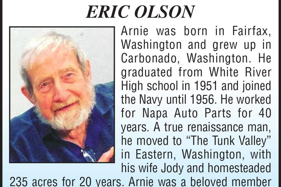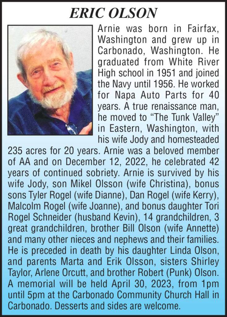 235 acres for 20 years. Arnie was a beloved member of AA and on December 12, 2022, he celebrated 42 years of continued sobriety. Arnie is survived by his wife Jody, son Mikel Olsson (wife Christina), bonus sons Tyler Rogel (wife Dianne), Dan Rogel (wife Kerry), Malcolm Rogel (wife Joanne), and bonus daughter Tori Rogel Schneider (husband Kevin), 14 grandchildren, 3 great grandchildren, brother Bill Olson (wife Annette) and many other nieces and nephews and their families. He is preceded in death by his daughter Linda Olson, and parents Marta and Erik Olsson, sisters Shirley Taylor, Arlene Orcutt, and brother Robert (Punk) Olson. A memorial will be held April 30, 2023, from 1pm until 5pm at the Carbonado Community Church Hall in Carbonado. Desserts and sides are welcome.