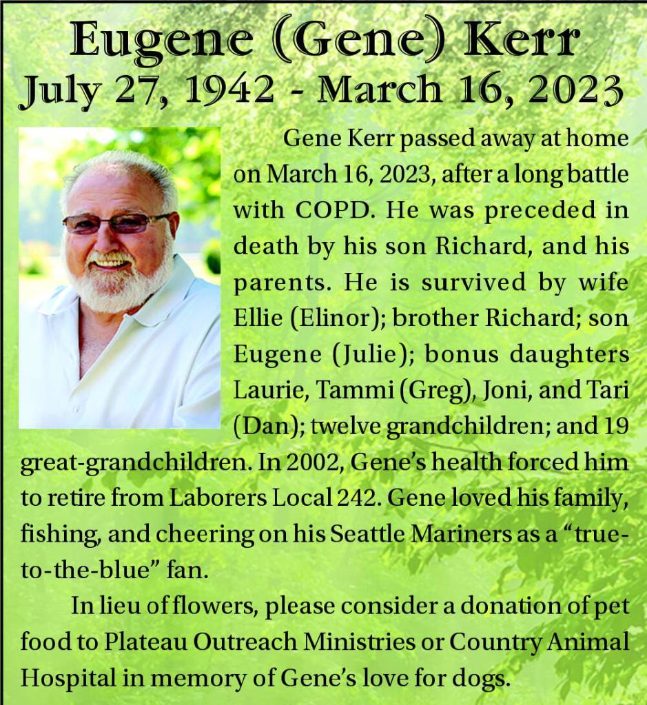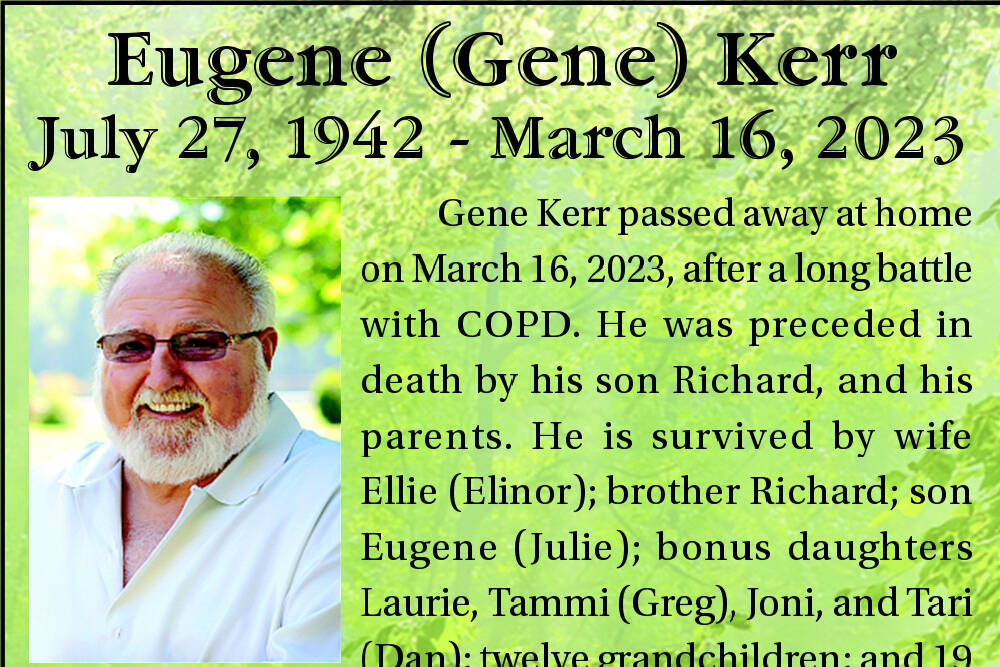 Gene Kerr passed away at home on March 16, 2023, after a long battle with COPD. He was preceded in death by his son Richard, and his parents. He is survived by wife Ellie (Elinor); brother Richard; son Eugene (Julie); bonus daughters Laurie, Tammi (Greg), Joni, and Tari (Dan); twelve grandchildren; and 19 great-grandchildren. In 2002, Gene’s health forced him to retire from Laborers Local 242. Gene loved his family, fishing, and cheering on his Seattle Mariners as a “true- to-the-blue” fan.