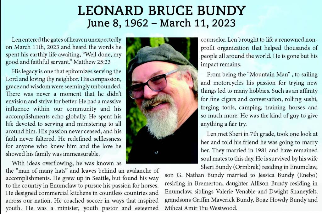 With ideas overflowing, he was known as the “man of many hats” and leaves behind an avalanche of accomplishments. He grew up in Seattle, but found his way to the country in Enumclaw to pursue his passion for horses. He designed commercial kitchens in countless countries and across our nation. He coached soccer in ways that inspired youth. He was a minister, youth pastor and esteemed counselor. Len brought to life a renowned non- profit organization that helped thousands of people all around the world. He is gone but his impact remains.