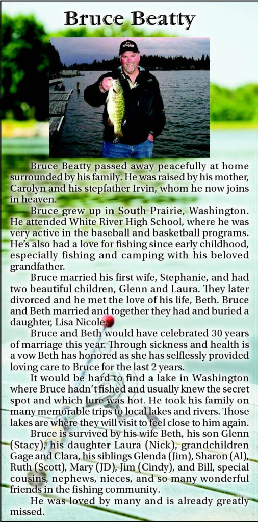 It would be hard to find a lake in Washington where Bruce hadn’t fished and usually knew the secret spot and which lure was hot. He took his family on many memorable trips to local lakes and rivers. Those lakes are where they will visit to feel close to him again. Bruce is survived by his wife Beth, his son Glenn (Stacy), his daughter Laura (Nick), grandchildren Gage and Clara, his siblings Glenda (Jim), Sharon (Al), Ruth (Scott), Mary (JD), Jim (Cindy), and Bill, special cousins, nephews, nieces, and so many wonderful friends in the fishing community.