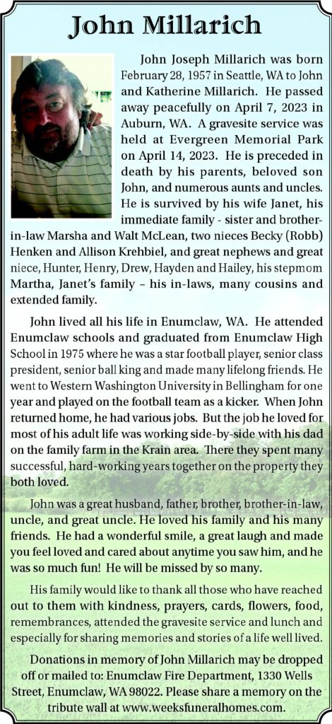 His family would like to thank all those who have reached out to them with kindness, prayers, cards, flowers, food, remembrances, attended the gravesite service and lunch and especially for sharing memories and stories of a life well lived.Donations in memory of John Millarich may be dropped off or mailed to: Enumclaw Fire Department, 1330 Wells Street, Enumclaw, WA 98022. Please share a memory on the tribute wall at www.weeksfuneralhomes.com.