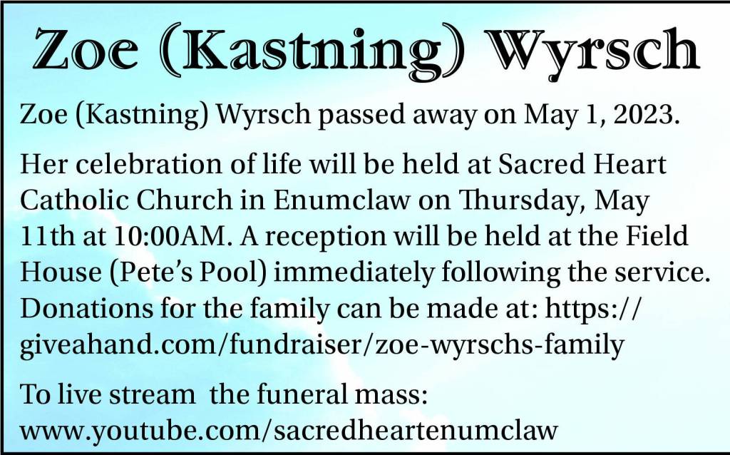 Zoe (Kastning) Wyrsch passed away on May 1, 2023.