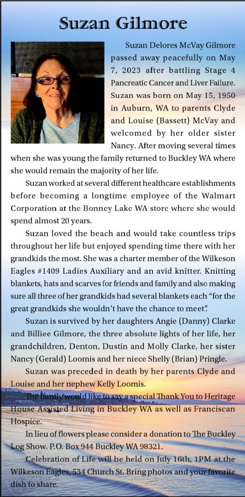 Suzan loved the beach and would take countless trips throughout her life but enjoyed spending time there with her grandkids the most. She was a charter member of the Wilkeson Eagles #1409 Ladies Auxiliary and an avid knitter. Knitting blankets, hats and scarves for friends and family and also making sure all three of her grandkids had several blankets each “for the great grandkids she wouldn’t have the chance to meet Suzan is survived by her daughters Angie (Danny) Clarke and Billiee Gilmore, the three absolute lights of her life, her grandchildren, Denton, Dustin and Molly Clarke, her sister Nancy (Gerald) Loomis and her niece Shelly (Brian) Pringle.
