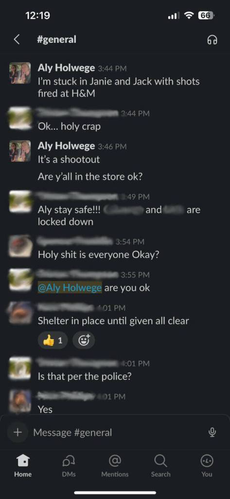 Alyson ran south to her building but ended up in Janie and Jack, a nearby children’s clothing store, with several other shoppers.