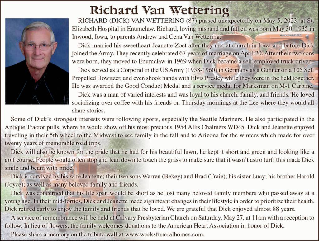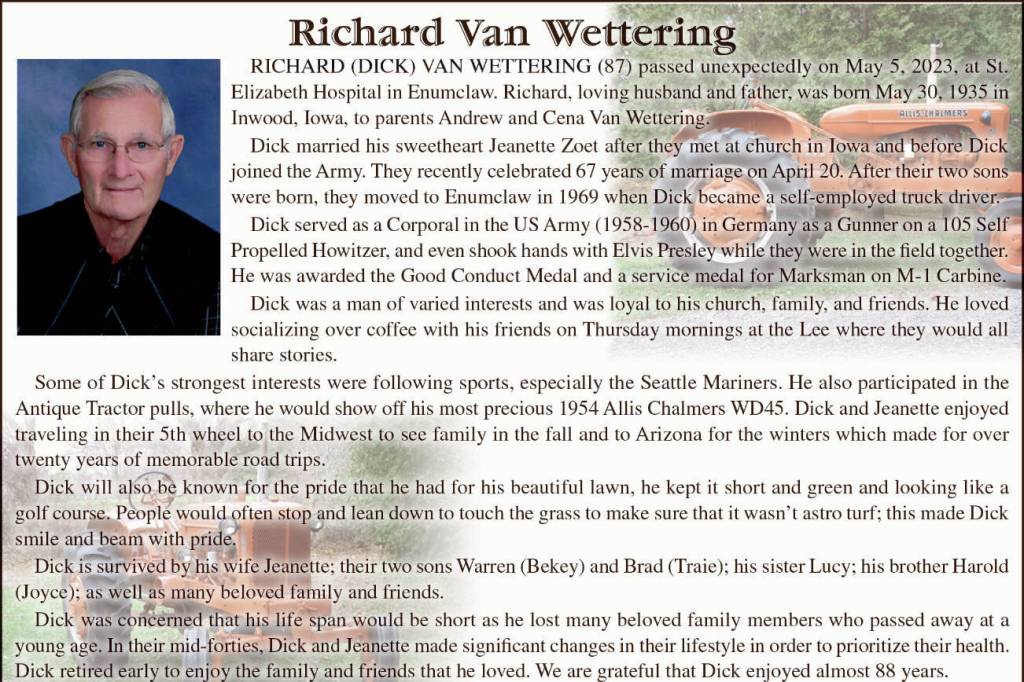 RICHARD (DICK) VAN WETTERING unexpectedly on May 5, 2023, at St. Elizabeth Hospital in Enumclaw. Richard, loving husband and father, was born May 30, 1935 in Inwood, Iowa, to parents Andrew and Cena Van Wettering.