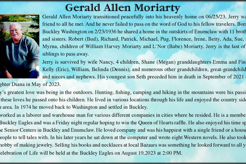 Gerald Allen Moriarty transitioned peacefully into his heavenly home on 06/25/23. Jerry was a friend to all he met. And he never failed to pass on the word of God to his fellow travelers. Born in Buckley Washington on 2/23/1936 he shared a home in the outskirts of Enumclaw with 11 brothers and sisters. Robert (Bud), Richard, Patrick, Michael, Pug, Florence, Irene, Betty, Ada, Sue, and Myrna, children of William Harvey Moriarty and L’Nor (Babe) Moriarty. Jerry is the last of his siblings to pass away.