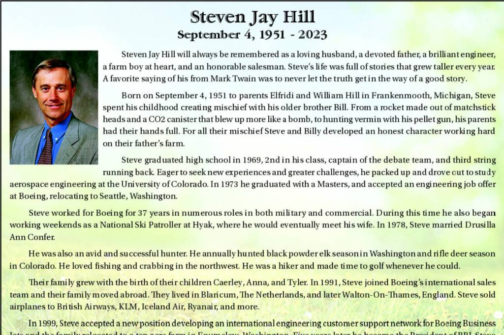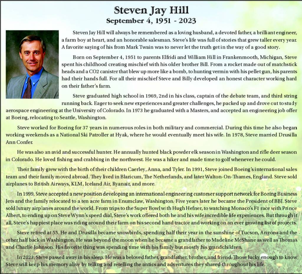 Steven Jay Hill will always be remembered as a loving husband, a devoted father, a brilliant engineer, a farm boy at heart, and an honorable salesman. Steve’s life was full of stories that grew taller every year.