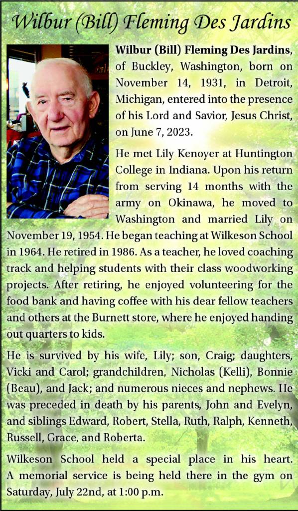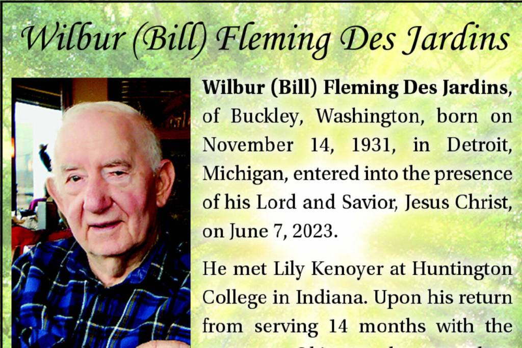Wilbur (Bill) Fleming Des Jardins, of Buckley, Washington, born on November 14, 1931, in Detroit, Michigan, entered into the presence of his Lord and Savior, Jesus Christ, on June 7, 2023.