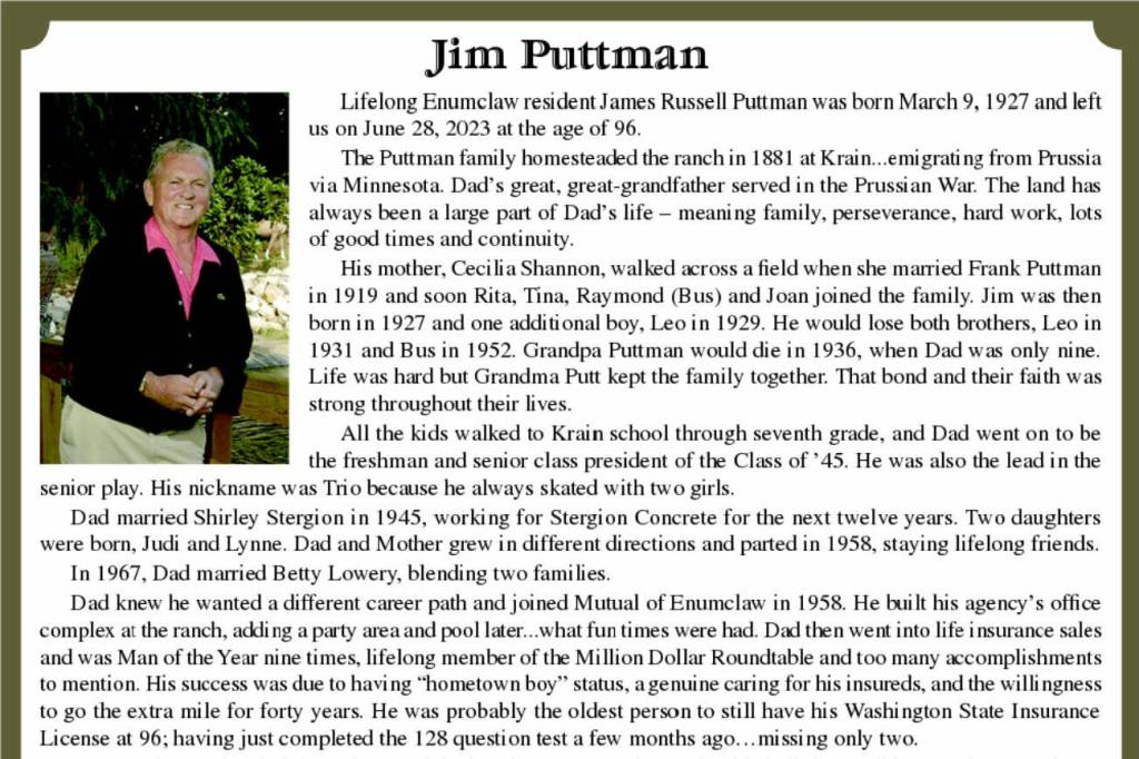 Lifelong Enumclaw resident James Russell Puttman was born March 9, 1927 and left us on June 28, 2023 at the age of 96.