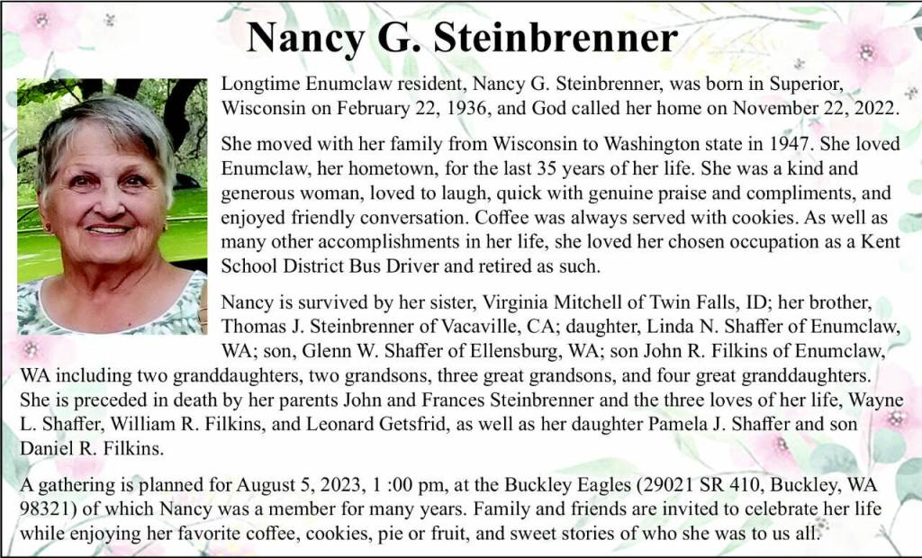 Longtime Enumclaw resident, Nancy G. Steinbrenner, was born in Superior, Wisconsin on February 22, 1936, and God called her home on November 22, 2022.