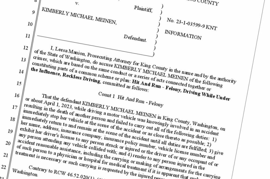 According to court documents, Kimberly Meinen was allegedly driving from the Muckleshoot Casino “where she had been drinking heavily” and was “escorted out by security” in the early hours of April 1 when the incident occurred.