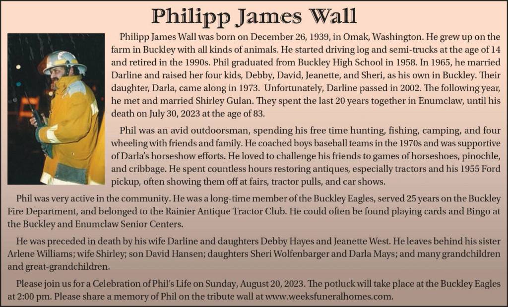 Please join us for a Celebration of Phil’s Life on Sunday, August 20, 2023. Te potluck will take place at the Buckley Eagles at 2:00 pm. Please share a memory of Phil on the tribute wall at www.weeksfuneralhomes.com.