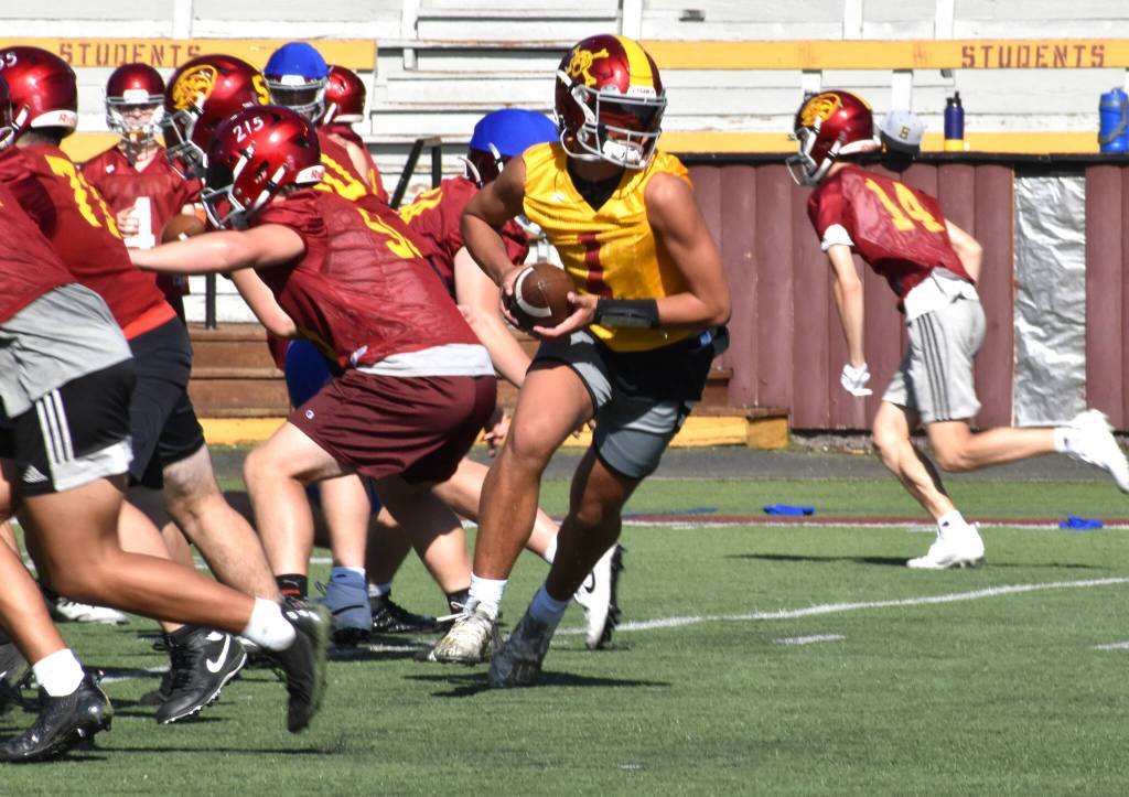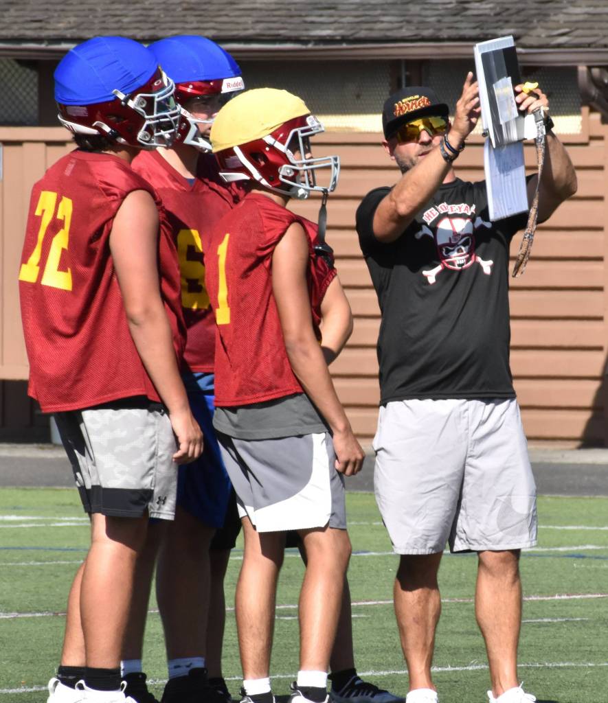Above, Enumclaw’s returning quarterback Gunnar Trachte prepares to hand off during the no-pads scrimmage, while head coach Mark Gunderson works on defensive schemes with the team’s No. 2 crew.