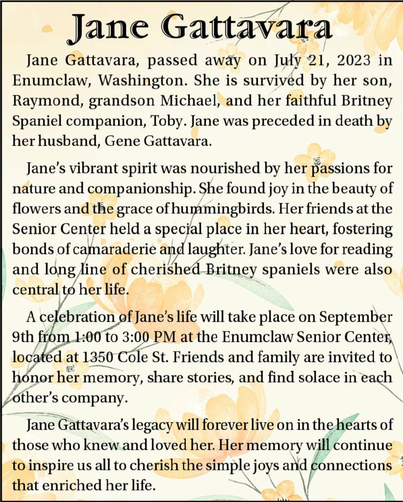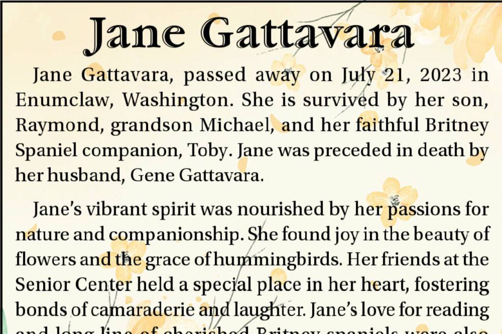 Jane Gattavara, passed away on July 21, 2023 in Enumclaw, Washington. She is survived by her son, Raymond, grandson Michael, and her faithful Britney Spaniel companion, Toby. Jane was preceded in death by her husband, Gene Gattavara.