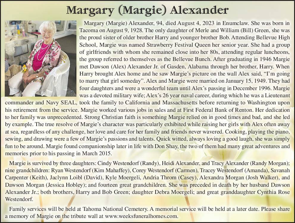 Margary (Margie) Alexander, 94, died August 4, 2023 in Enumclaw. She was born in Tacoma on August 9, 1928. The only daughter of Merle and William (Bill) Green, she was the proud sister of older brother Harry and younger brother Bob. Attending Bellevue High School, Margie was named Strawberry Festival Queen her senior year. She had a group of girlfriends with whom she remained close into her 80s, attending regular luncheons, the group referred to themselves as the Bellevue Bunch. After graduating in 1946 Margie met Dawson (Alex) Alexander Jr. of Gasden, Alabama through her brother, Harry.