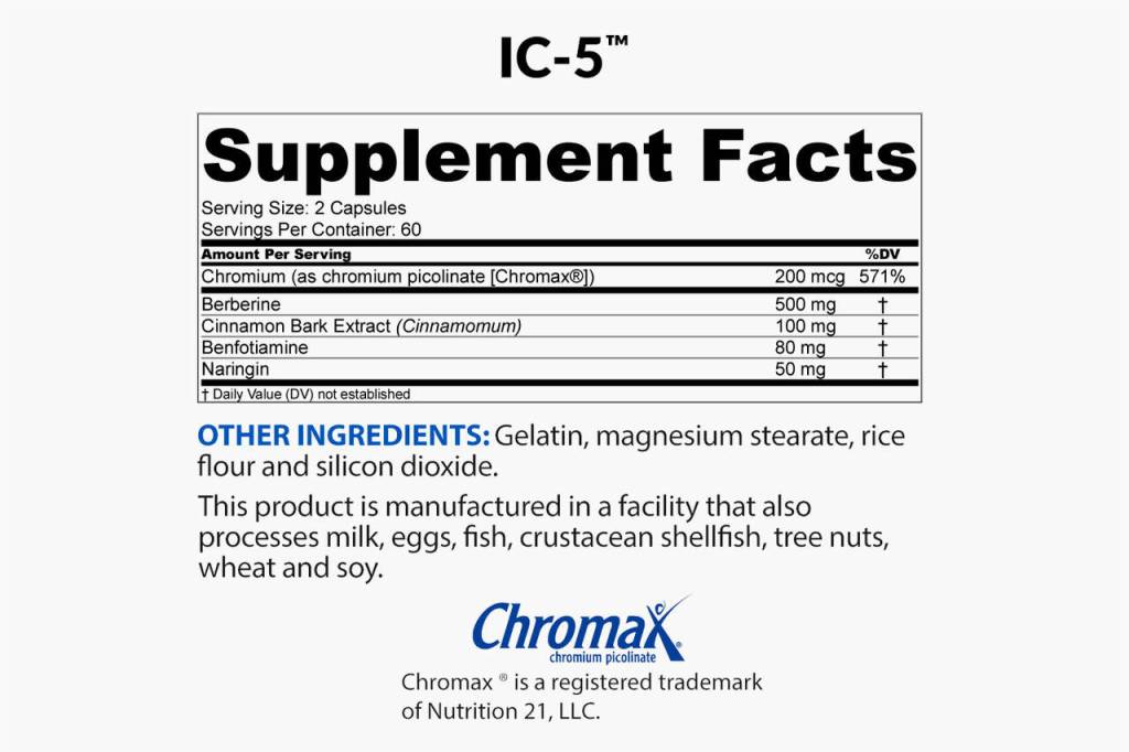 IC-5 contains a proprietary form of chromium picolinate known as “Chromax.” Studies on Chromax show it has high bioavailability in the digestive system and impacts insulin sensitivity and blood glucose management.