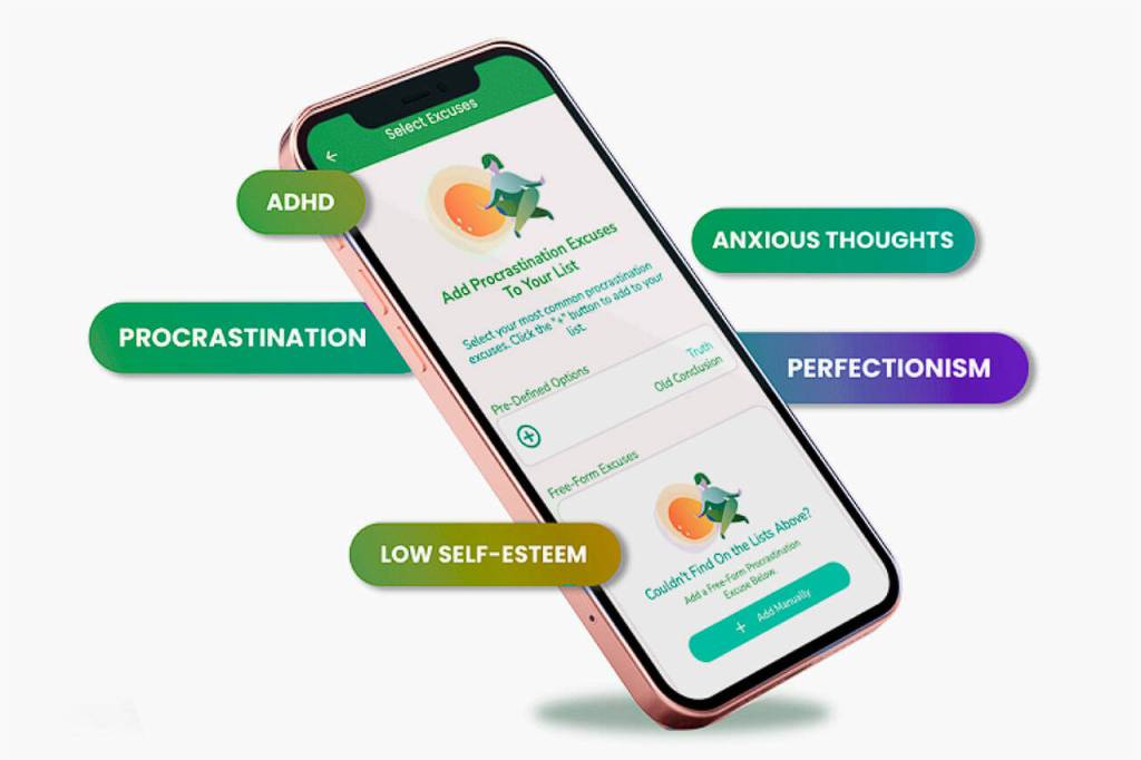 It provides self-reflection exercises to identify negative stimuli hindering you from starting and finishing tasks on time. These include false beliefs and excuses.