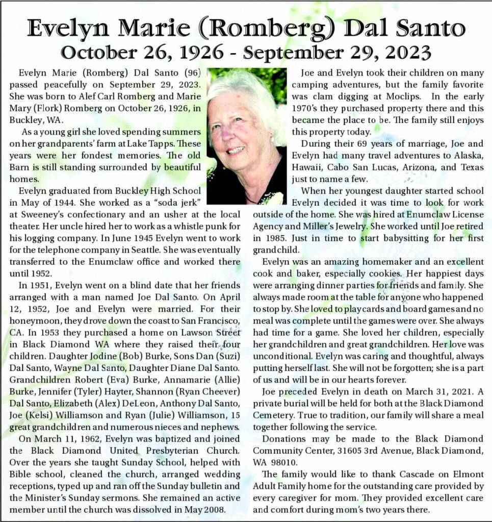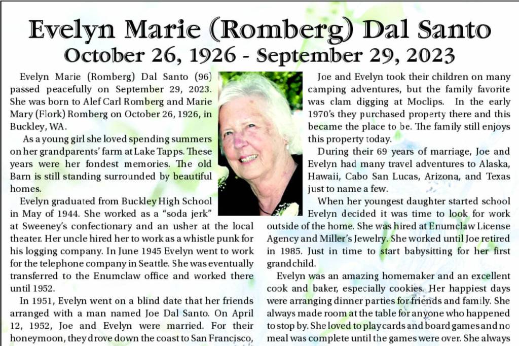 Evelyn Marie (Romberg) Dal Santo (96) passed peacefully on September 29, 2023. She was born to Alef Carl Romberg and Marie Mary (Flork) Romberg on October 26, 1926, in Buckley, WA.