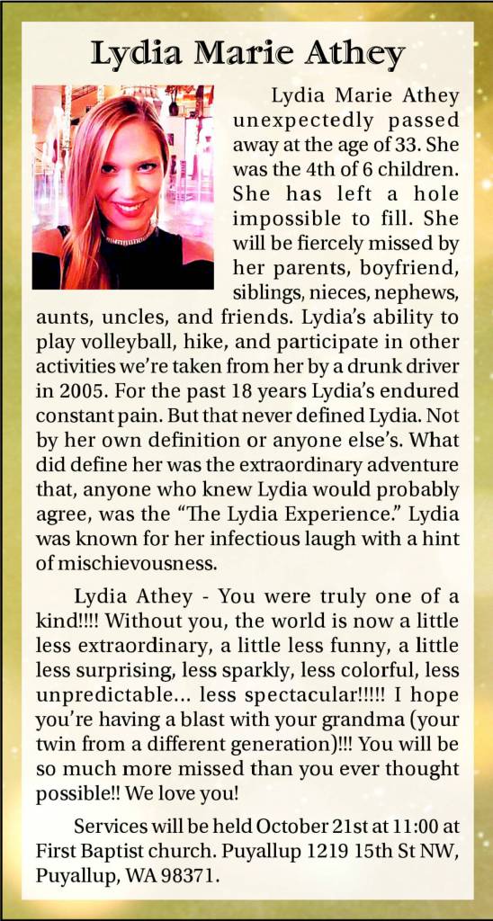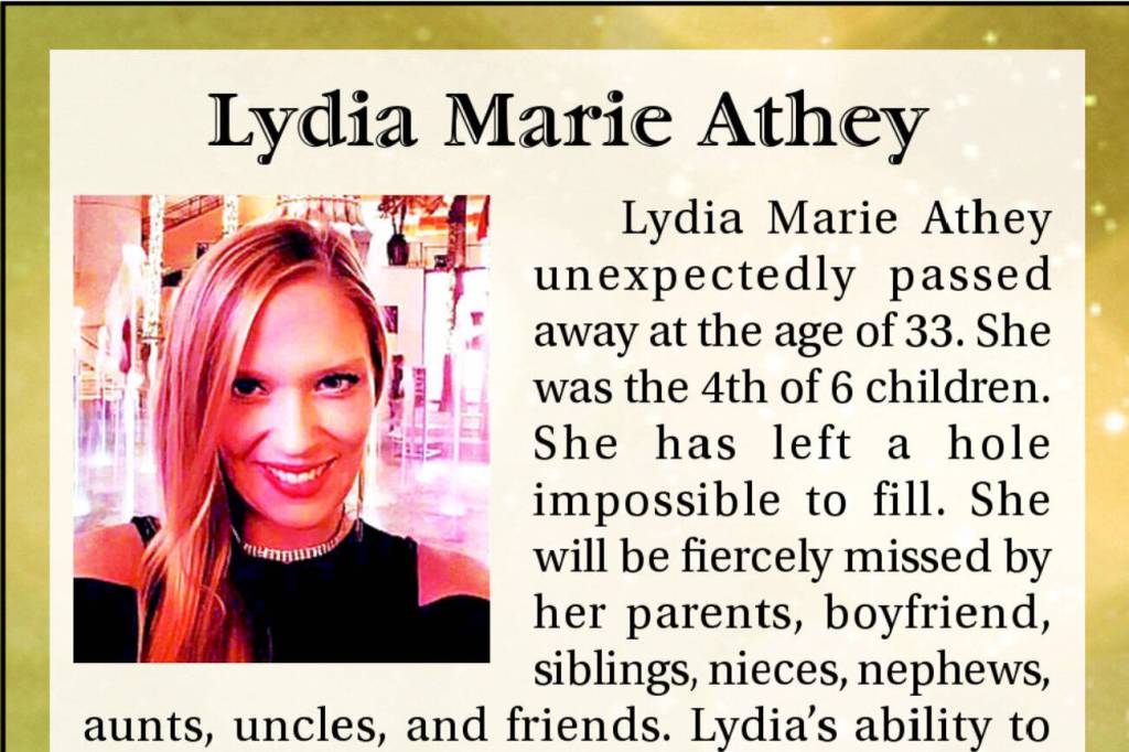 Lydia Marie Athey unexpectedly passed away at the age of 33. She was the 4th of 6 children.