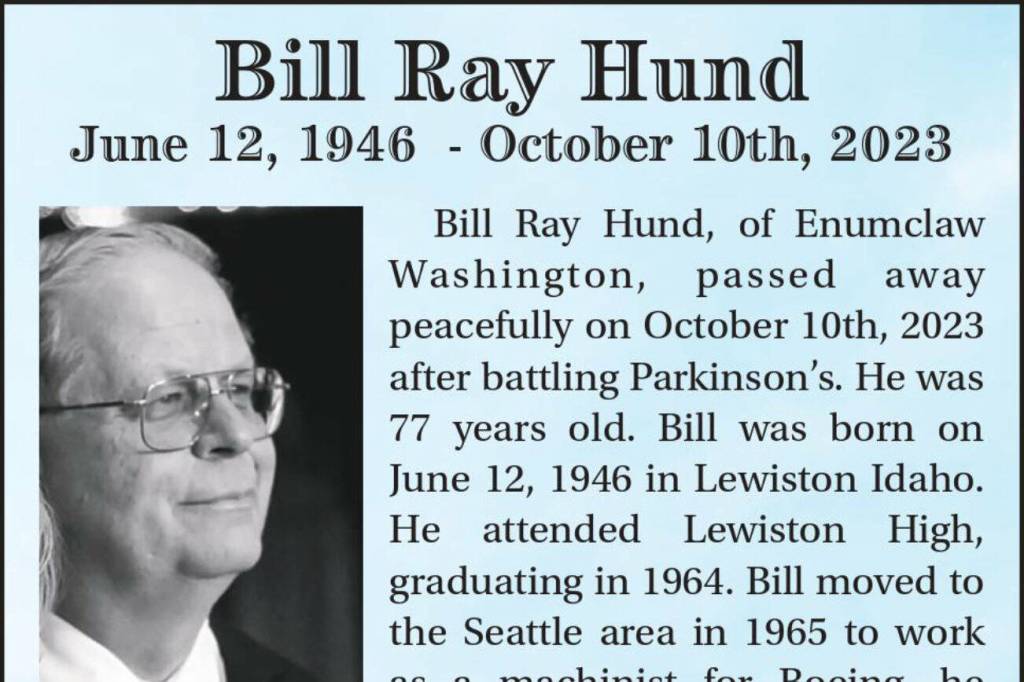Bill Ray Hund, of Enumclaw Washington, passed away peacefully on October 10th, 2023 after battling Parkinson’s. He was77 years old. Bill was born on June 12, 1946 in Lewiston Idaho.