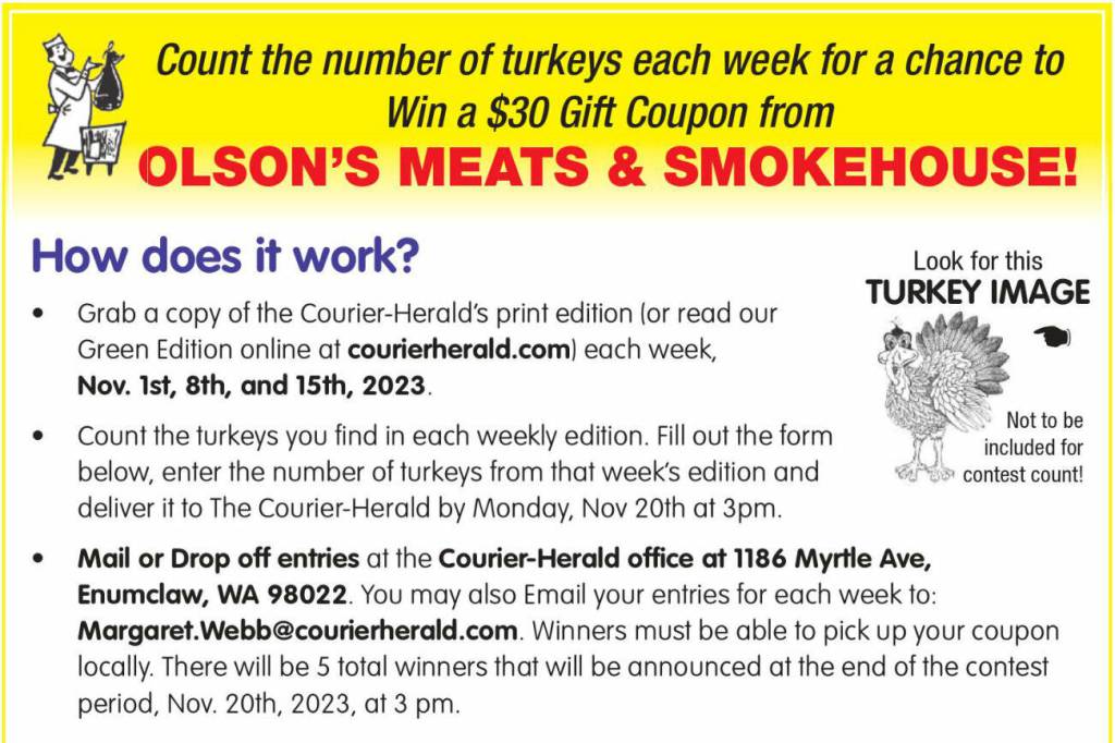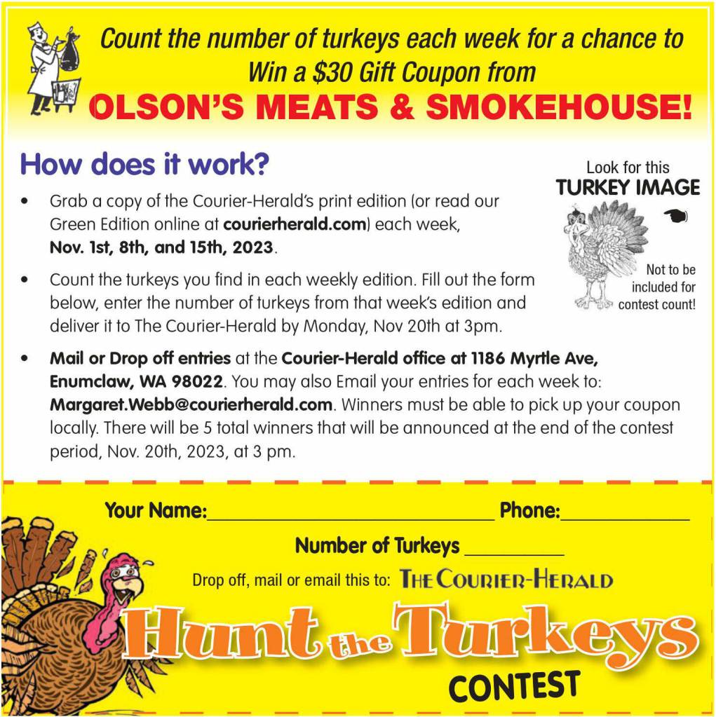 Once you think you caught them all, find the official contest cut-out, write down your guess of the total number of turkeys (from all three editions), and turn it into the Courier-Herald by Nov. 20 by 3 p.m.