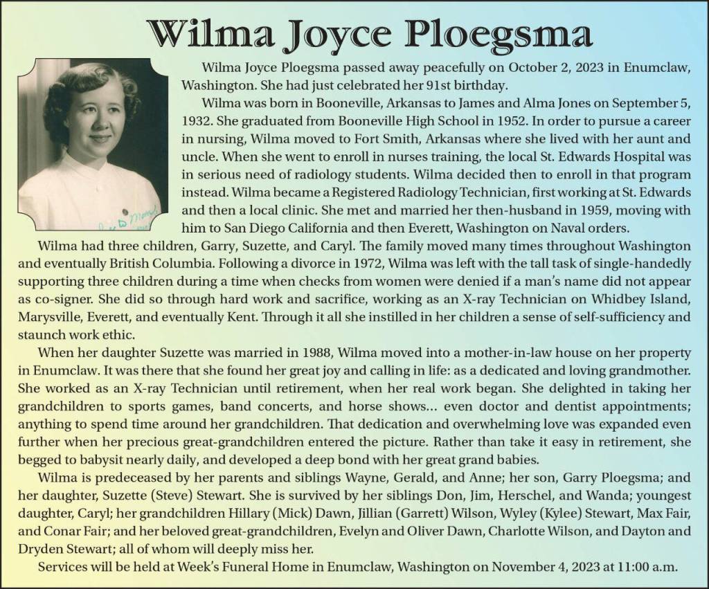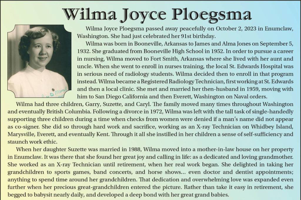Wilma Joyce Ploegsma passed away peacefully on October 2, 2023 in Enumclaw, Washington. She had just celebrated her 91st birthday.