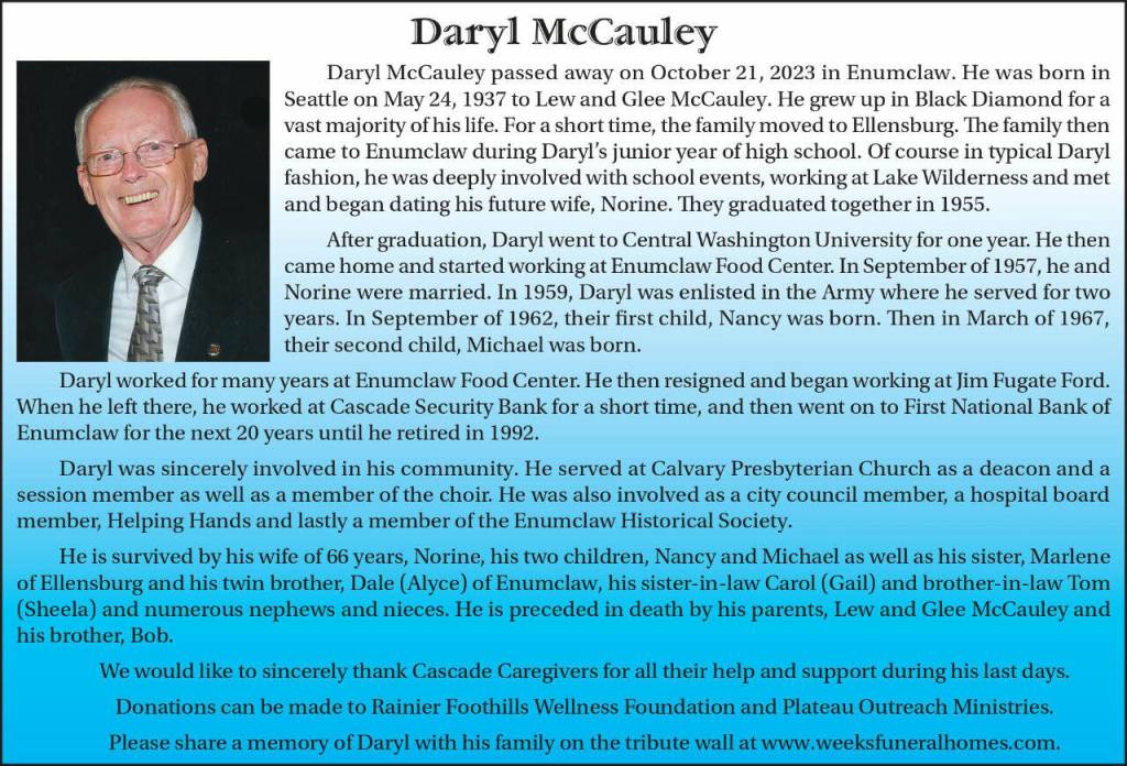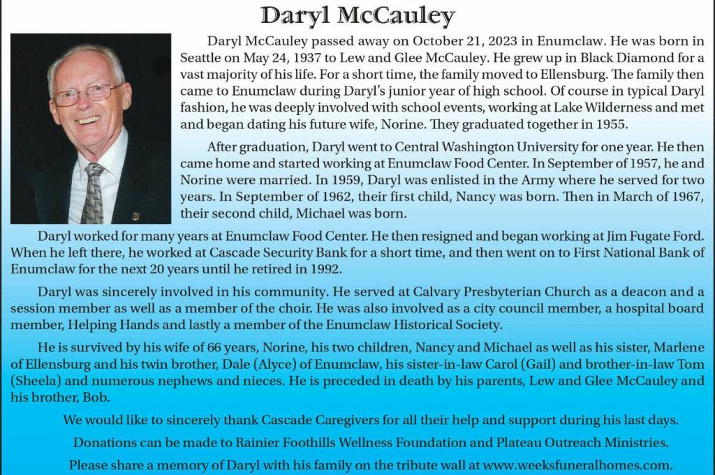 Daryl McCauley passed away on October 21, 2023 in Enumclaw. He was born in Seattle on May 24, 1937 to Lew and Glee McCauley. He grew up in Black Diamond for a vast majority of his life. For a short time, the family moved to Ellensburg. Te family then came to Enumclaw during Daryl’s junior year of high school. Of course in typical Daryl fashion, he was deeply involved with school events, working at Lake Wilderness and met and began dating his future wife, Norine. Tey graduated together in 1955.