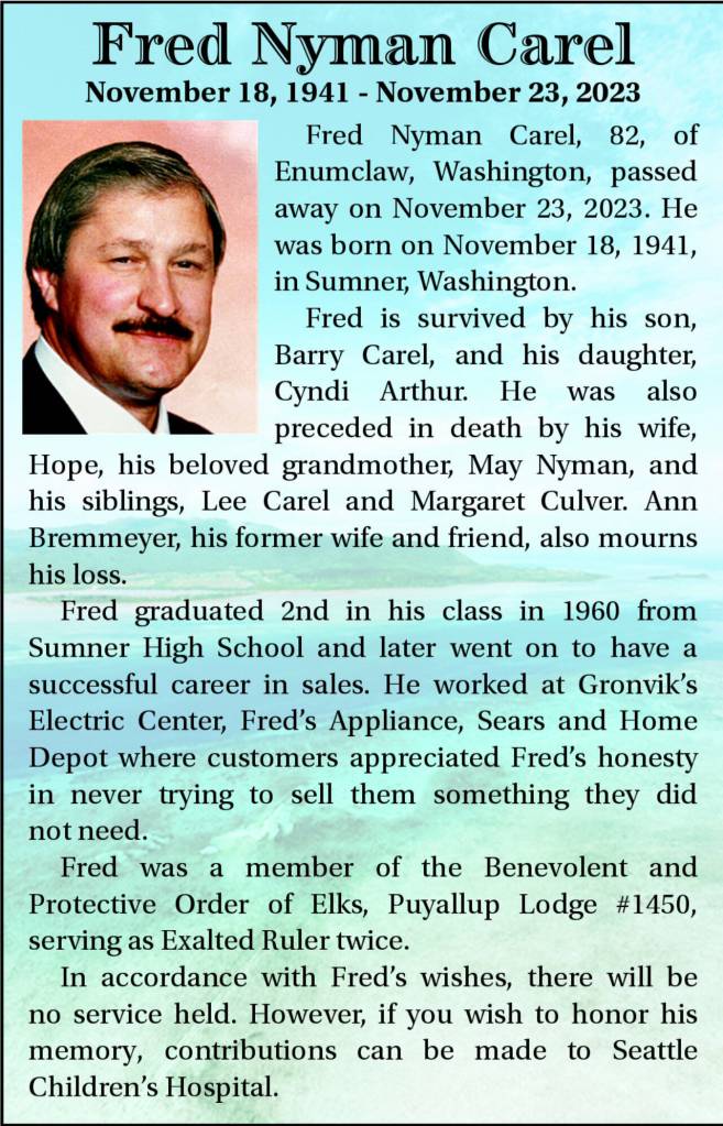 Fred Nyman Carel, 82, of Enumclaw, Washington, passed away on November 23, 2023. He was born on November 18, 1941, in Sumner, Washington.