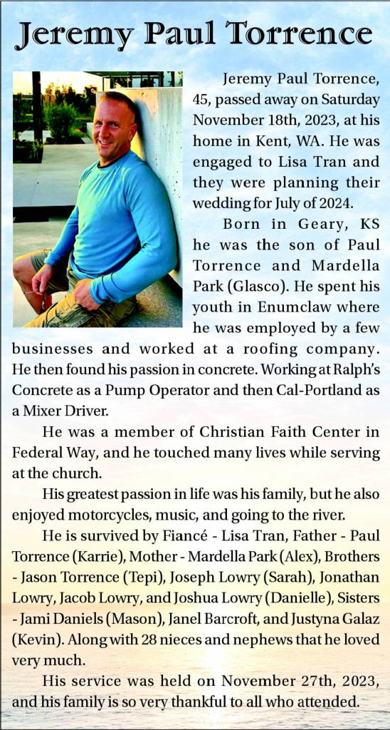 Jeremy Paul Torrence, 45, passed away on Saturday November 18th, 2023, at his home in Kent, WA.
