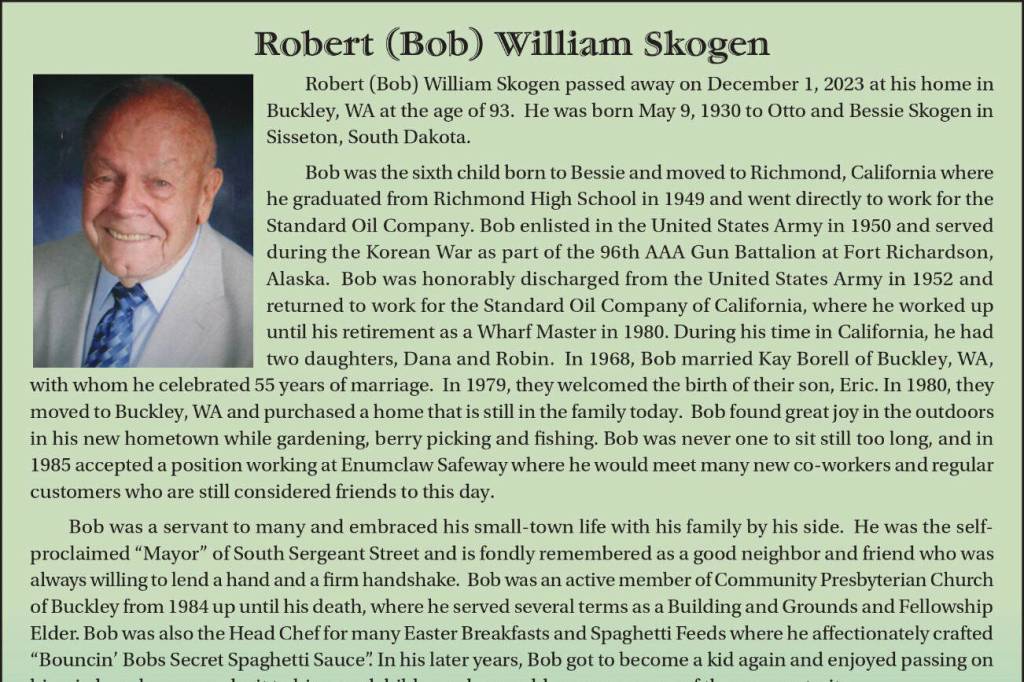 Robert (Bob) William Skogen passed away on December 1, 2023 at his home in Buckley, WA at the age of 93. He was born May 9, 1930 to Otto and Bessie Skogen in Sisseton, South Dakota.
