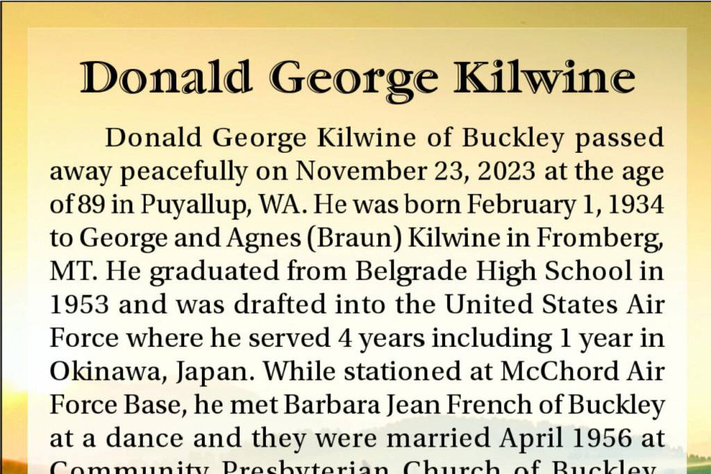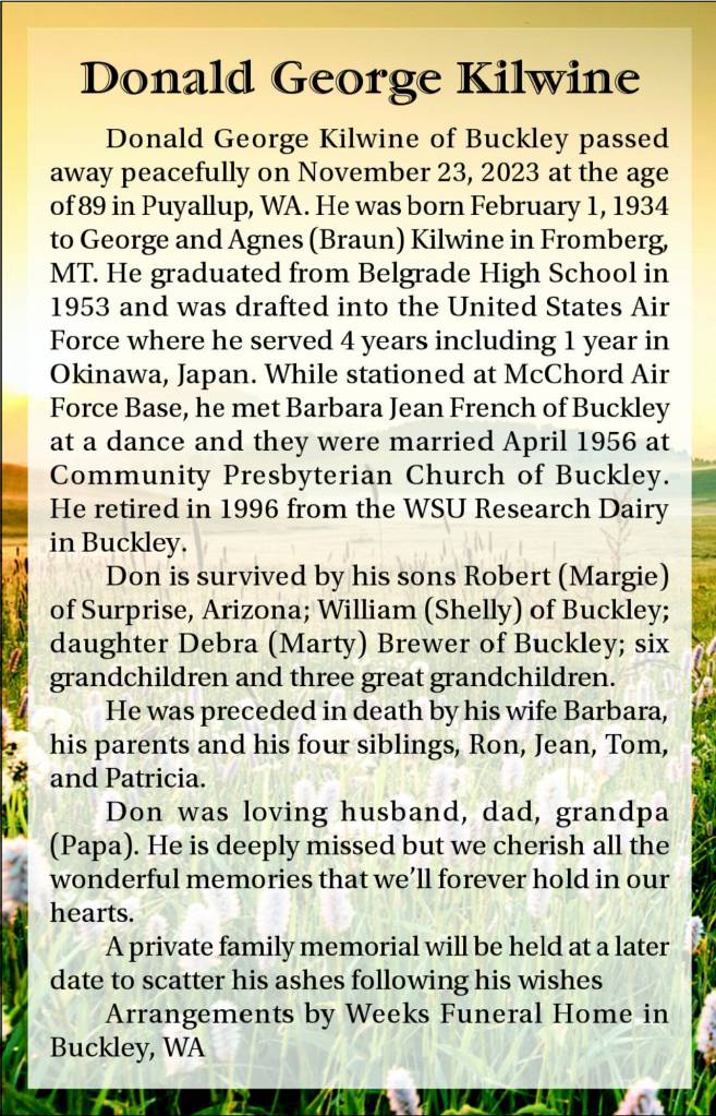 Donald George Kilwine of Buckley passed away peacefully on November 23, 2023 at the age of 89 in Puyallup, WA. He was born February 1, 1934 to George and Agnes (Braun) Kilwine in Fromberg, MT. He graduated from Belgrade High School in 1953 and was drafted into the United States Air Force where he served 4 years including 1 year in Okinawa, Japan. While stationed at McChord Air Force Base, he met Barbara Jean French of Buckley at a dance and they were married April 1956 at Community Presbyterian Church of Buckley.