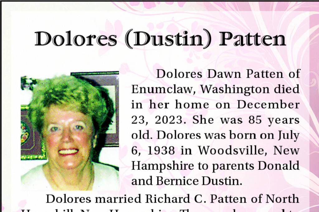Dolores Dawn Patten of Enumclaw, Washington died in her home on December 23, 2023. She was 85 years old. Dolores was born on July 6, 1938 in Woodsville, New Hampshire to parents Donald and Bernice Dustin.